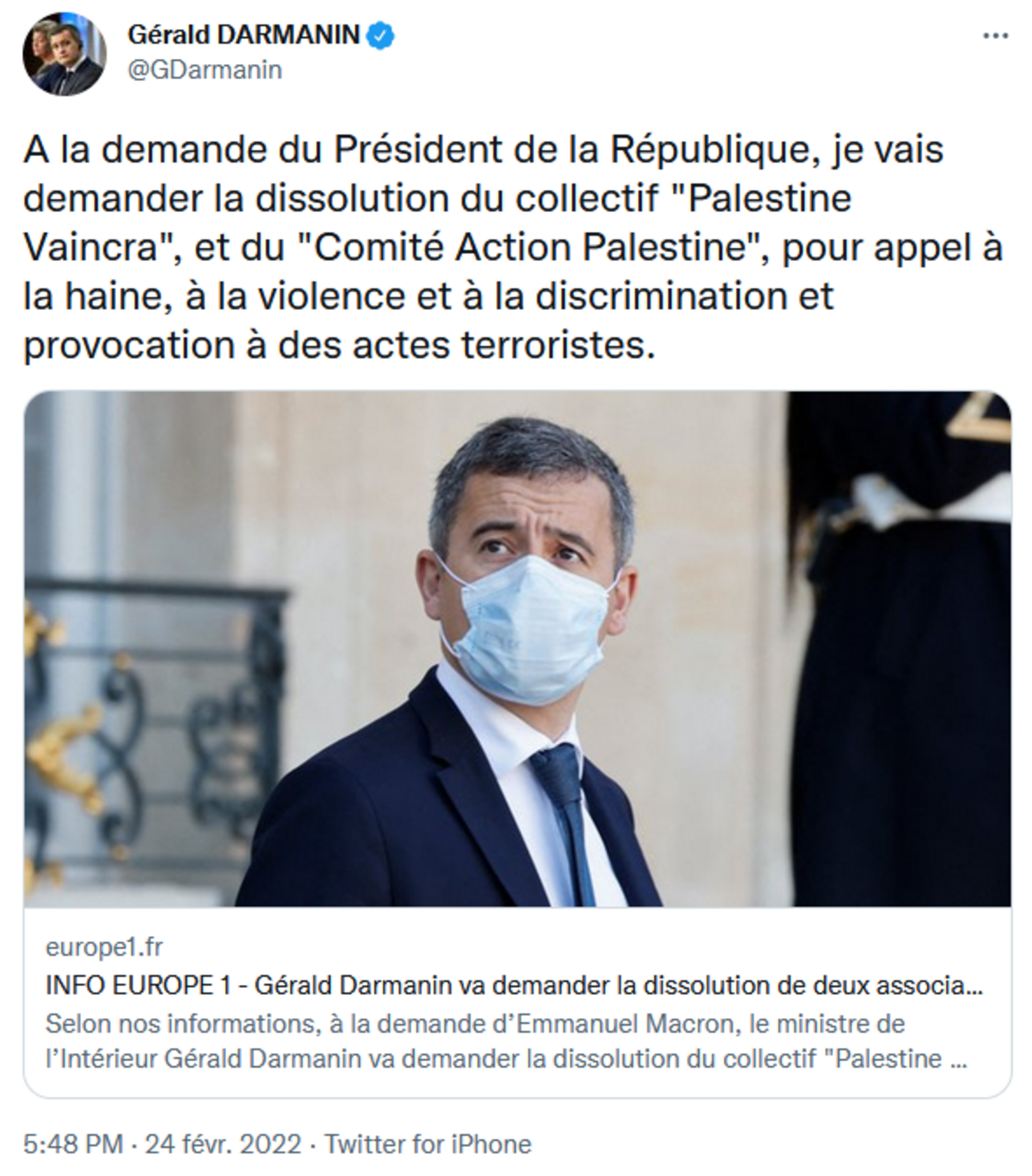 Le 24 février 2022, le Collectif apprend par Tweeter et dépêche AFP que Gerald Darmanin sur demande d’Emmanuel Macron, voulait dissoudre le Collectif Palestine Vaincra.