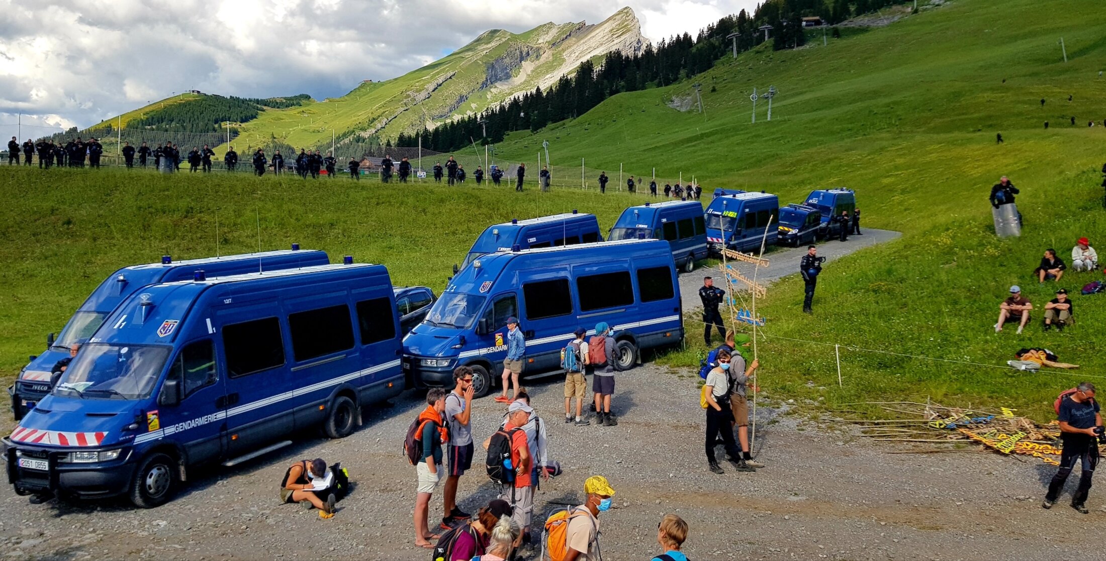 Le samedi tout d’abord, La Clusaz est littéralement encerclée et prise d’assaut par la gendarmerie, avec une trentaine de cars de gendarmes, deux hélicoptères, un drone et des barrages filtrants le long de la route qui mène au Col de la Croix Fry où se sont donnés rendez-vous les militant.e.s. Je suis contrôlé deux fois, mon scooter fouillé de fond en comble et quelques affaires personnelles particulièrement dangereuses gardées sur place par les pandores : ma gourde en Inox pleine de redoutable eau, mon effrayant bloque disque et ma terrible clé à bougie.