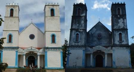 La cathédrale de Rikitea en 1999 (à gauche) et en 2008 (à droite).