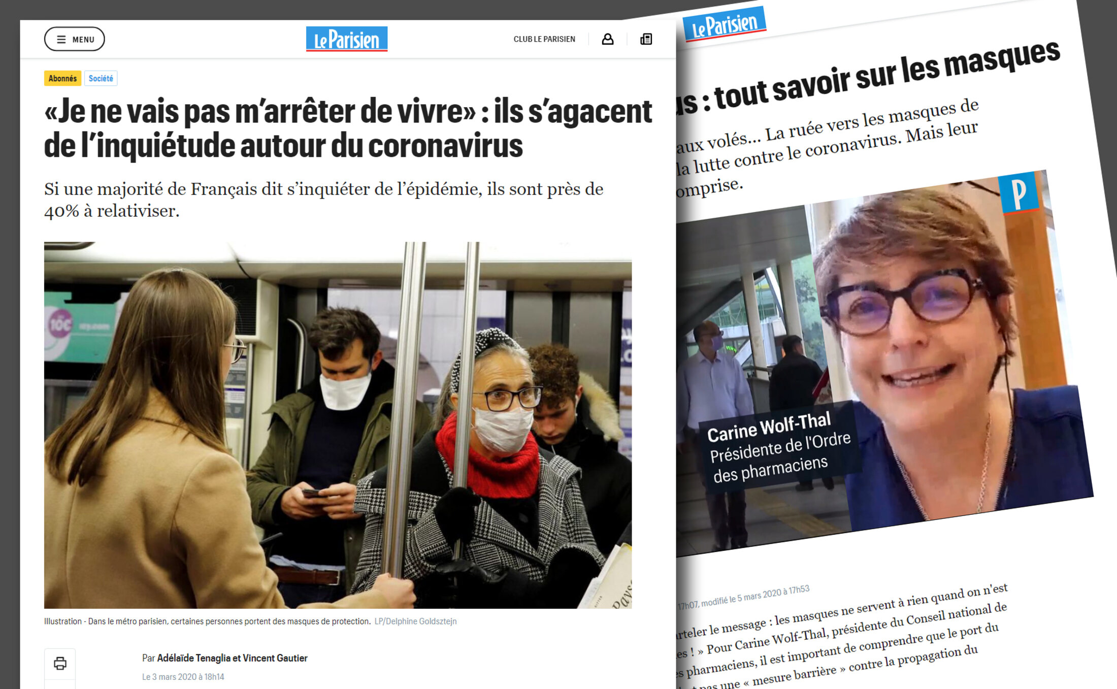 Une vidéo mensongère. Dans une vidéo du 5 mars (5), Le Parisien propose, grâce à une interview de la présidente du Conseil national de l'Ordre des pharmaciens, Carine Wolf-Thal, de « tout savoir sur les masques ». Le résultat est incomplet, confus, maladroit et mensonger. « Très honnêtement, affirme notre experte à l’intention du grand public, il faut marteler le message : les masques ne servent à rien quand on n'est pas malade, ne protègent pas. Ça ne sert à rien d’avoir ces masques. » Quelques instants plus tôt, elle a pourtant reconnu l’efficacité du masque respiratoire FFP2, mais pour en tirer une conclusion bien particulière : « Le masque FFP2 est hermétique (…) et lui, effectivement, protège la personne qui le porte mais, du coup, doit être réservé au personnel soignant qui est au plus proche des malades porteurs du coronavirus (…). » À la question « Pourquoi n’est-il pas accessible à tous ? », Carine Wolf-Thal va apporter une réponse étonnante : « Imaginez : vous portez un masque FFP2, donc le plus contraignant, pendant trois ou quatre heures quand vous êtes dehors. Puis, vous rentrez à la maison : il suffit que vous baissiez le masque trois secondes pour boire et manger, par exemple, et ça annule tout l’effort que vous avez fait pendant trois heures parce que vos enfants sont rentrés de l’école, ne se sont pas lavés les mains, etc., etc. » Autrement dit : les masques FFP2 ne sont pas efficaces quand vous ne les portez pas… Quelle magnifique démonstration !