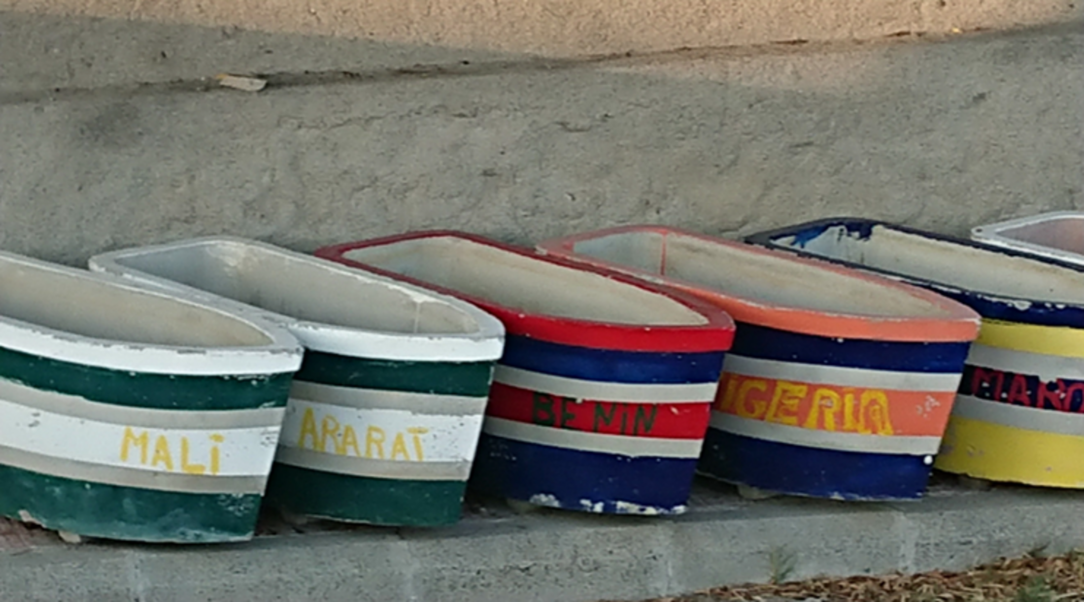 Petits navires en béton représentant les différentes nationalités de migrants accueillis à Riace: