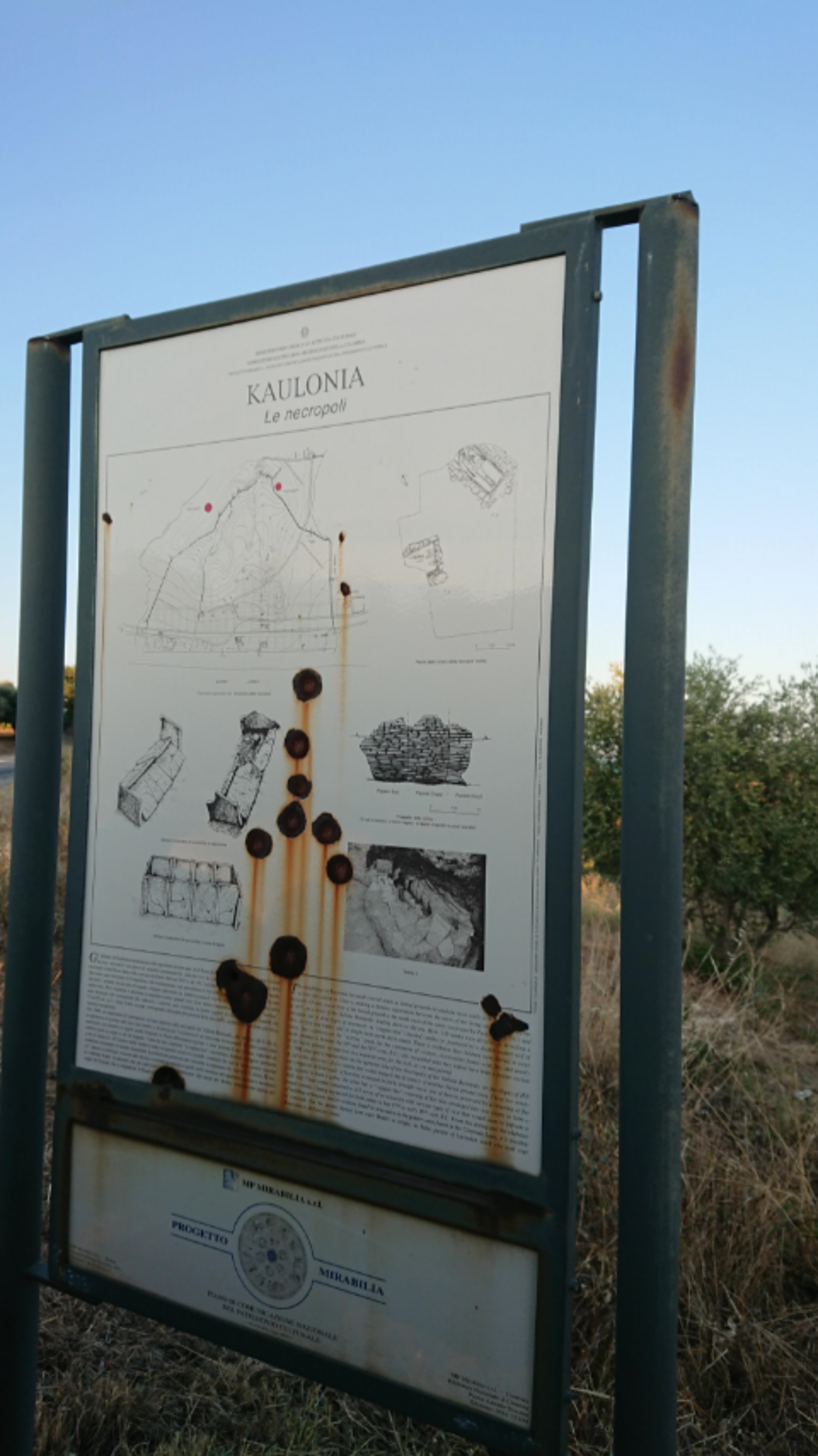 Panneaux d’information du site archéologique de Caulonia criblé d’impacts de balles tirées par la ‘ndrangheta: