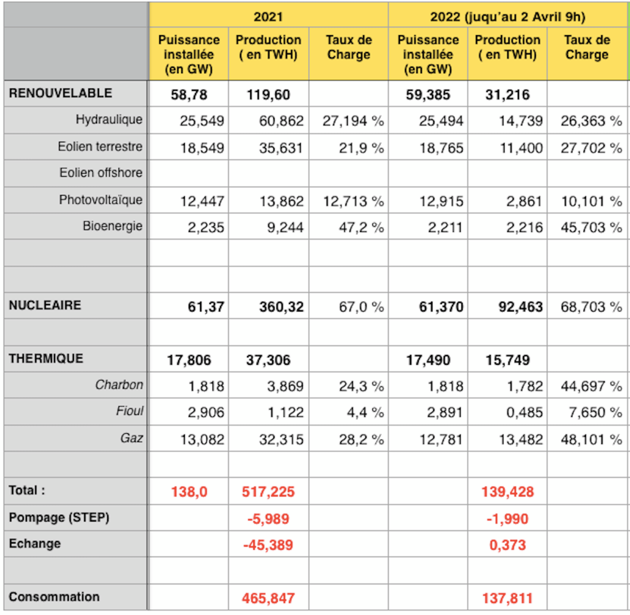 La comparaison des filières de production d’électricité RTE entre 2021 et le premier trimestre 2022, montre que :