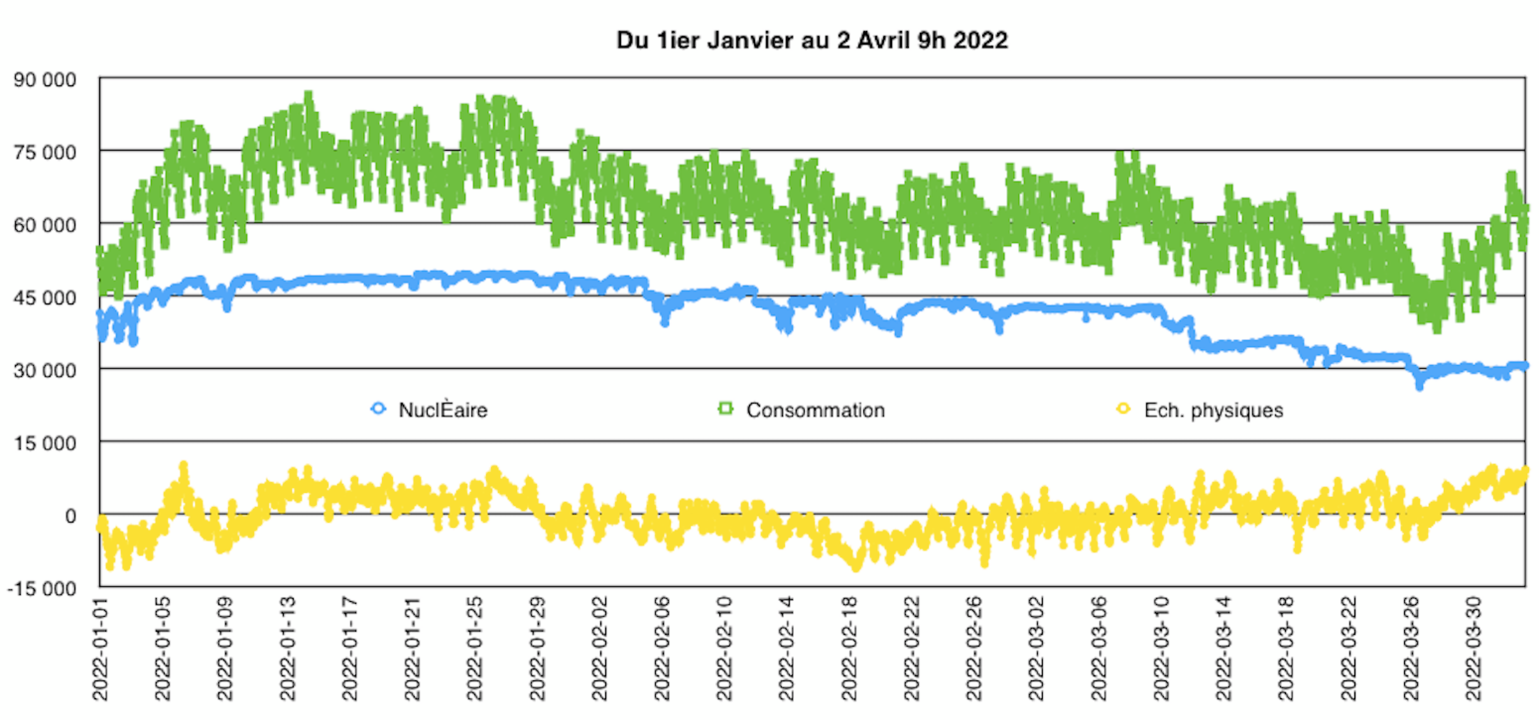 La production d’électricité sur le premier trimestre 2022 de la filière nucléaire est amoindrie de près de 15 GW entre mi janvier et fin mars. Cela est dû à l’arrêt pour maintenance de 11 réacteurs sur 56. Cette perte de production est compensée partiellement par les filières thermique charbon, fioul et gaz, et l’importation d’électricité des pays voisins (import : courbe jaune au dessus du zéro).