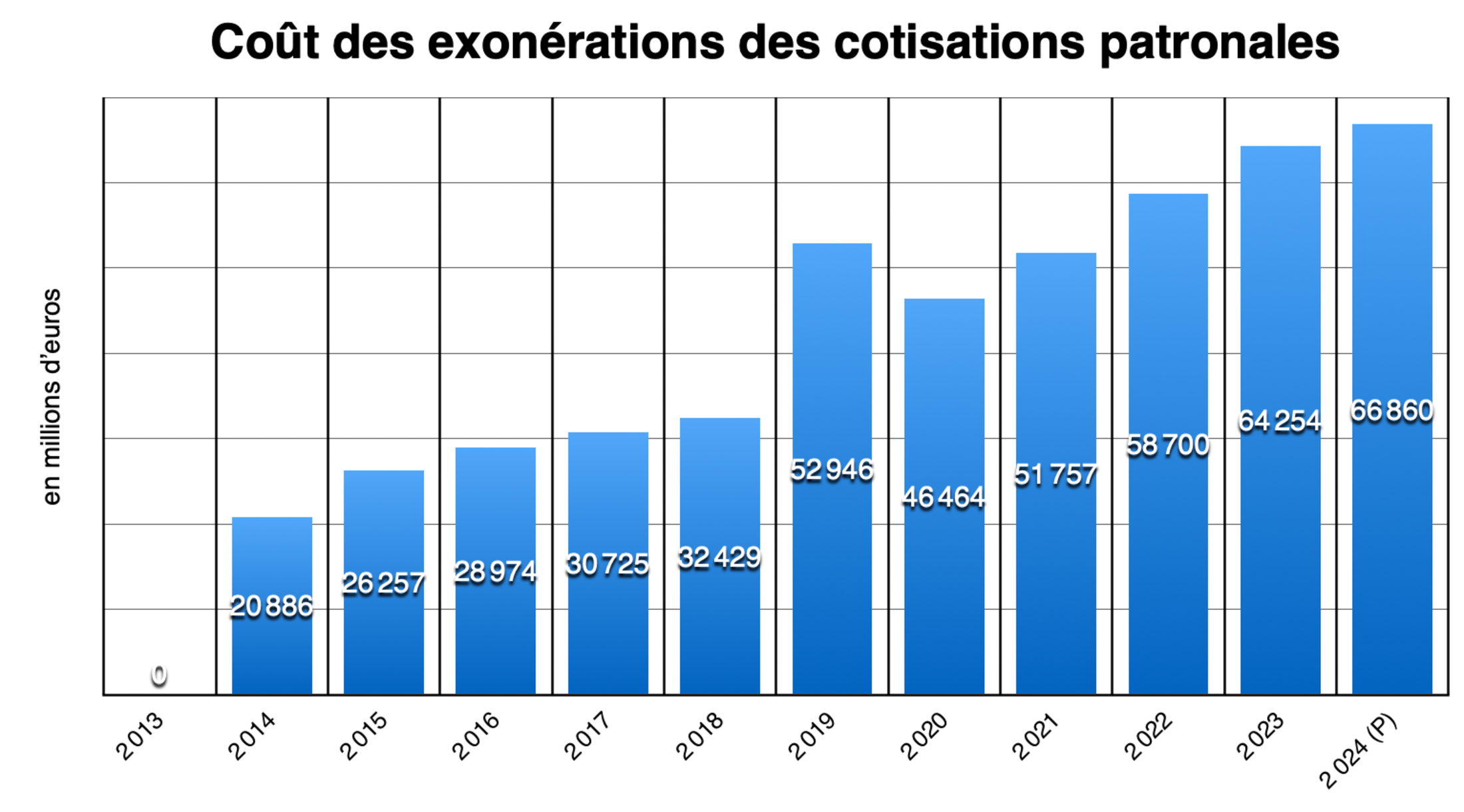 Selon l’annexe « Présentation des mesures de réduction et d’exonération de cotisations et contributions ainsi que leur compensation » des PLFSS (Projet de Loi de Finance de la Sécurité Sociale), la transformation du CICE en baisse de charges pérennes en 2019 a doublé la charges de l’Etat entre 2018 (32, 4 Md€) et 2024 (66,8 Md€). En 2019 la charge a progressé de 30 milliards d’euros du fait de l’immédiateté de la baisse des cotisations patronales et du crédit d’impôt sur les salaires de 2018 (versé en 2019).