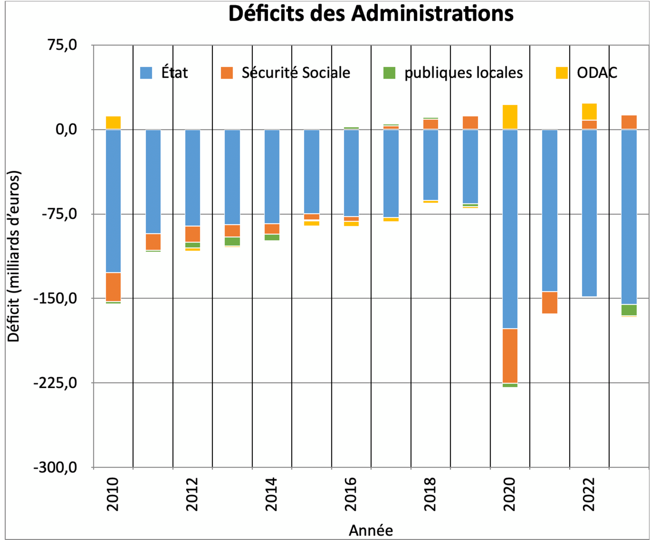 Selon les données de l’Insee les déficits des quatre administrations se répartissent de la façon suivante entre 2010 et 2023 :