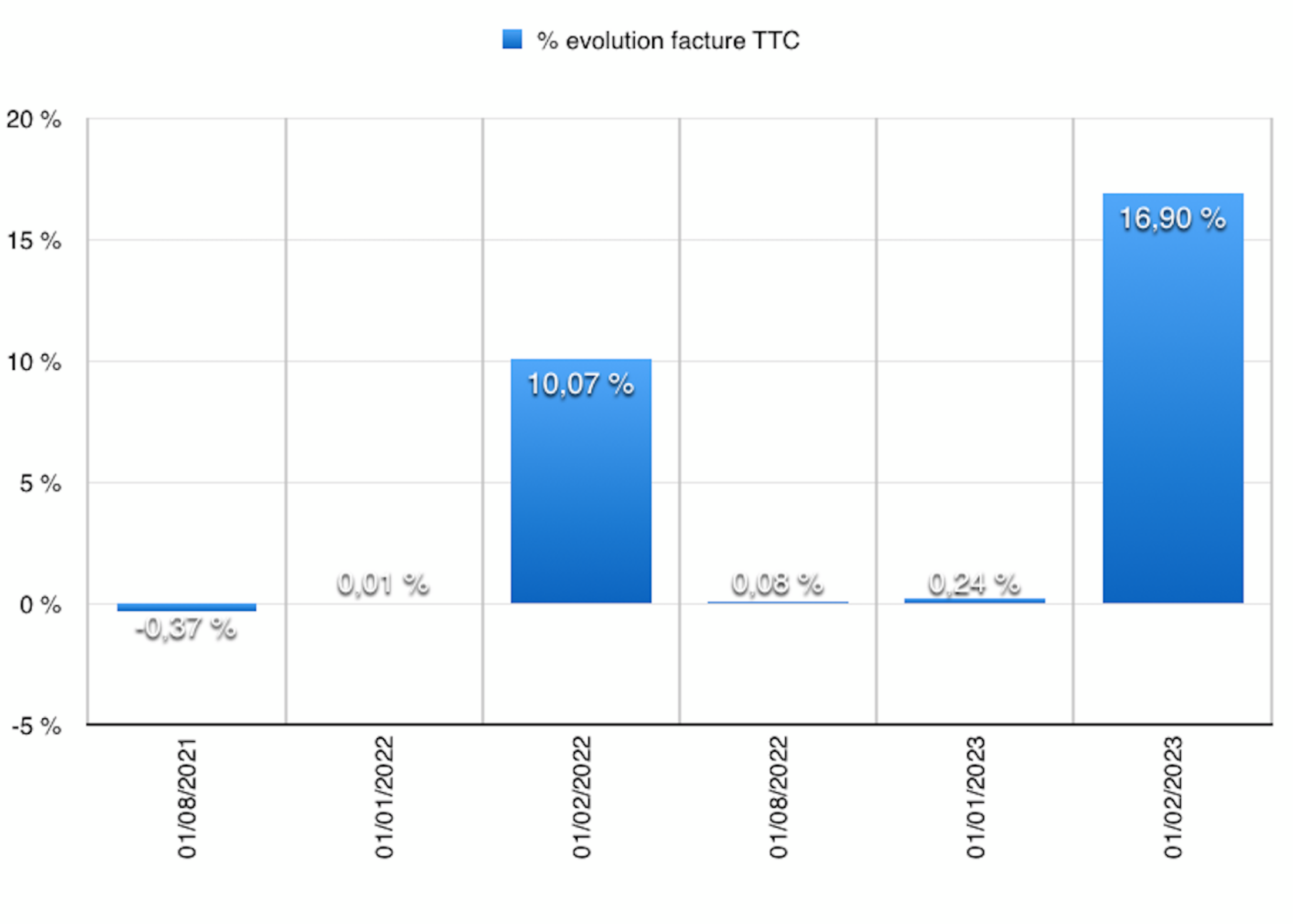 Au 1er février 2023, l’augmentation TTC est de 16,90 % sur la facture mensuelle, malgré le maintient du bouclier tarifaire jusqu’à fin 2023.