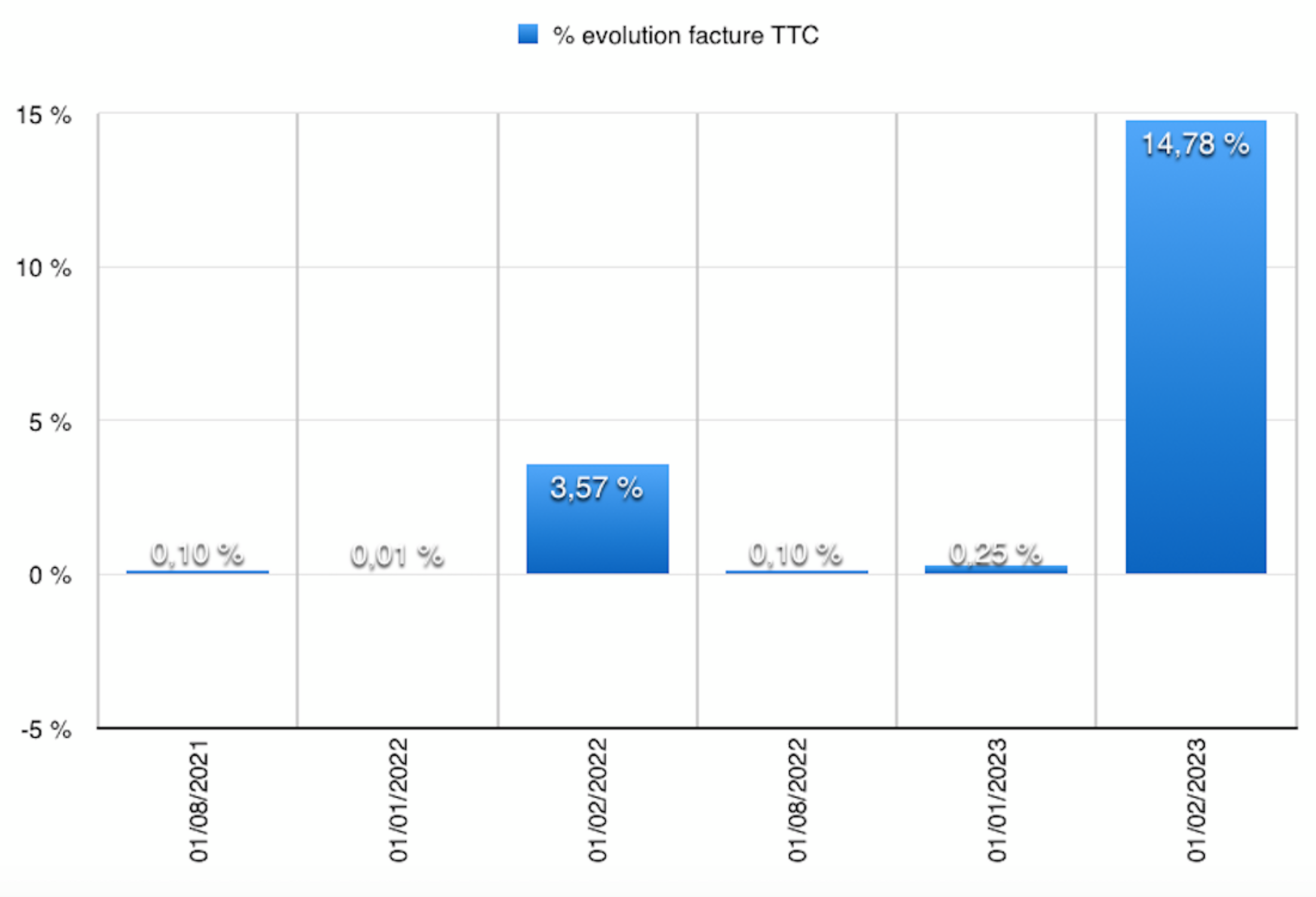 Au 1er février 2022, il y a eu une augmentation TTC de 10% sur la facture mensuelle, malgré la mise en place du bouclier tarifaire.
