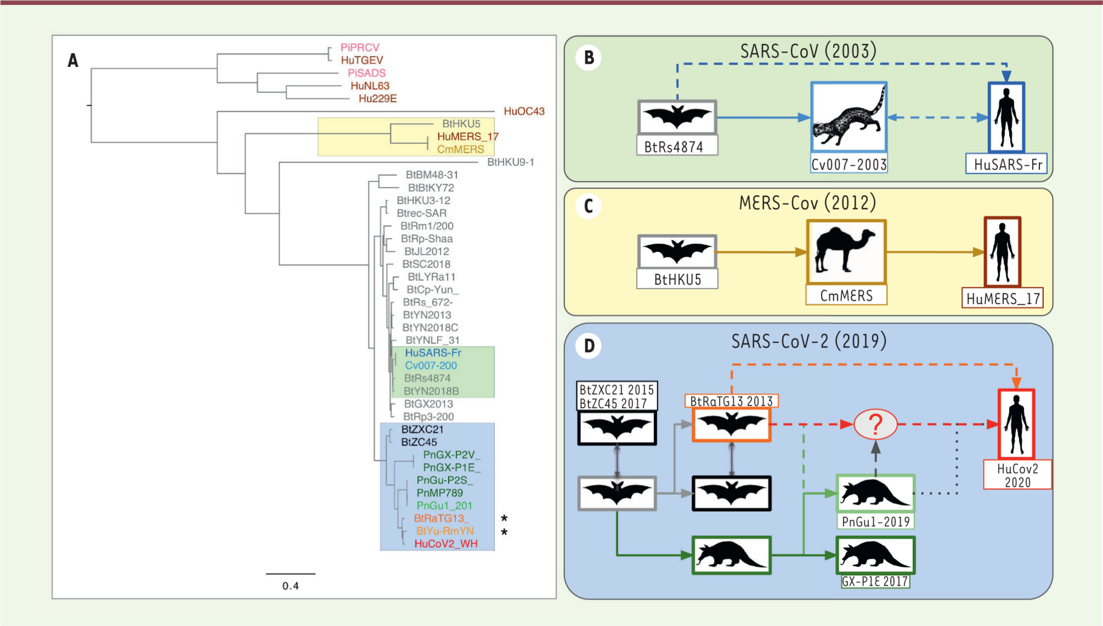 L’analyse phylogénétique du génome du SARS-Cov-2 montre qu’il est à 96% identique au génome RaTG13 (chauve souris des mines de la province de Yunnan), sauf dans la région du domaine de liaison au récepteur cellulaire (spicule) , où l’unicité tombe à 70%. Voir l'arbre de génomes complet du coronavirus ci-dessous.