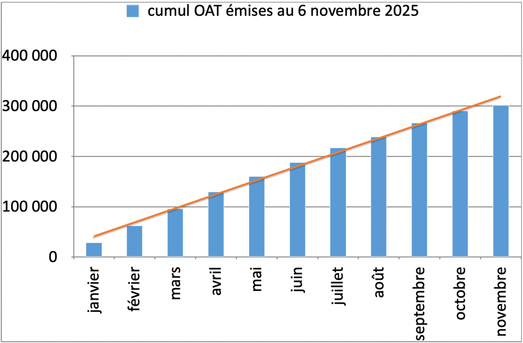 Selon l’Agence France Trésor les OAT émises au 6 novembre 2025 atteignent 302 Md€, soit 29,1 Md€ / mois (courbe corrélation en orange).