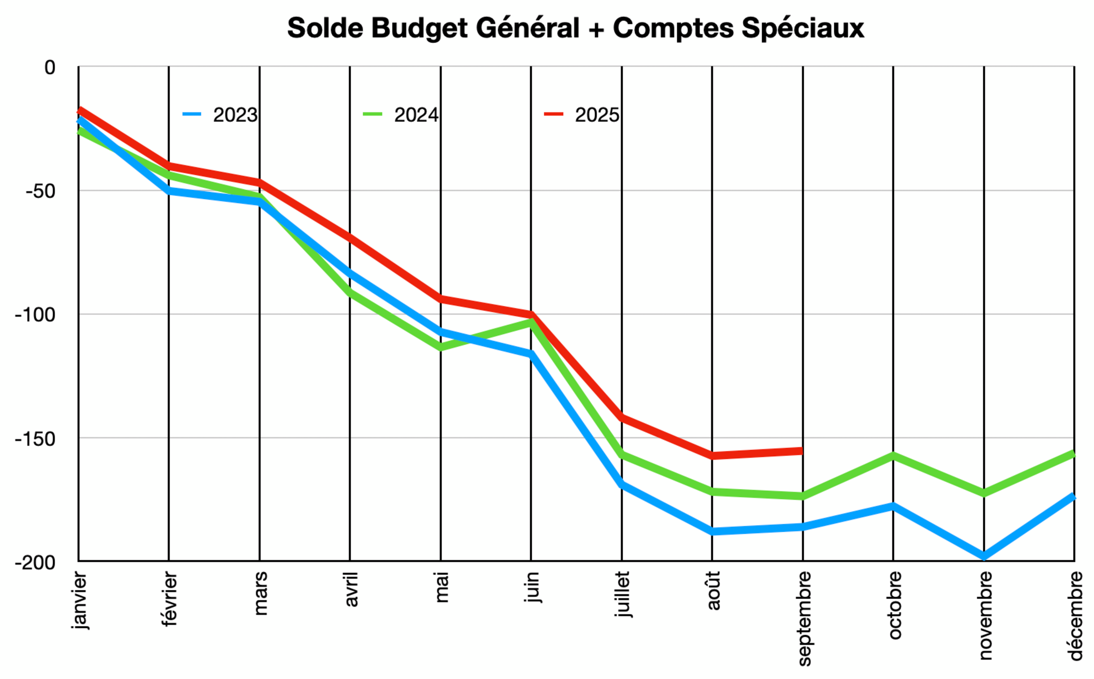 Pour rappel, dans la PLF 2025, l’État planifie d’emprunter 300 Md€ pour boucler le budget 2025, afin de couvrir le remboursement des OAT arrivant à maturité (175,9 Md€) , et le déficit de 142,1 Md€. Selon les relevés mensuels de l’État, le déficit de 142 Md€ était atteint fin juillet 2025, et fin septembre il est de 155,4 Md€, soit un dérapage de 13,4 Md€.