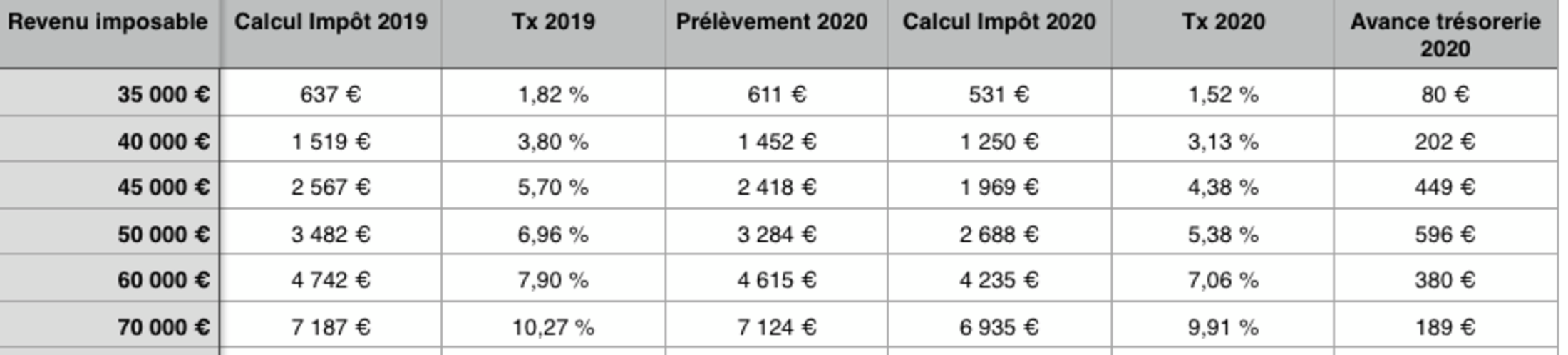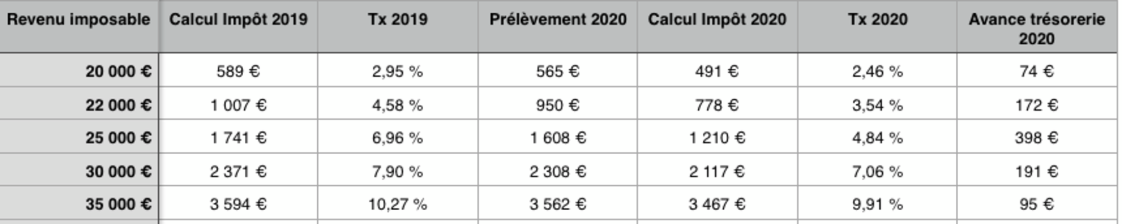 Ainsi l’avance de trésorerie, avec le prélèvement à la source, pour un célibataire pourra atteindre 400 € pour un revenu imposable de 25 000 € (soit un revenu net mensuel de 2 010 €). Ce contribuable aura cotisé pendant 8 mois 2,12 % de trop, ce qui représente 2,12% x 25 000 x 0,75 = 400 €.