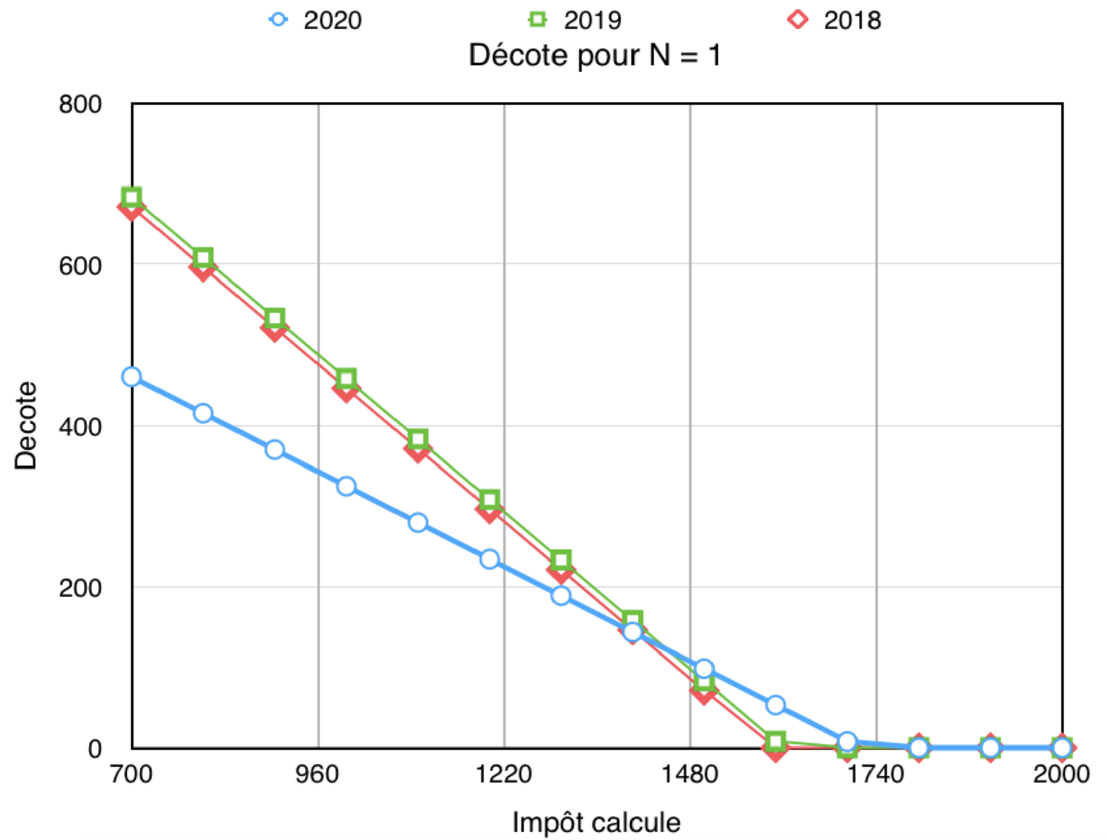 Pour un Célibataire, la décote 2020 sera plus faible pour un impôt calculé inférieur à 1 400 € environ. Par contre l’assiette de la décote sera plus large.