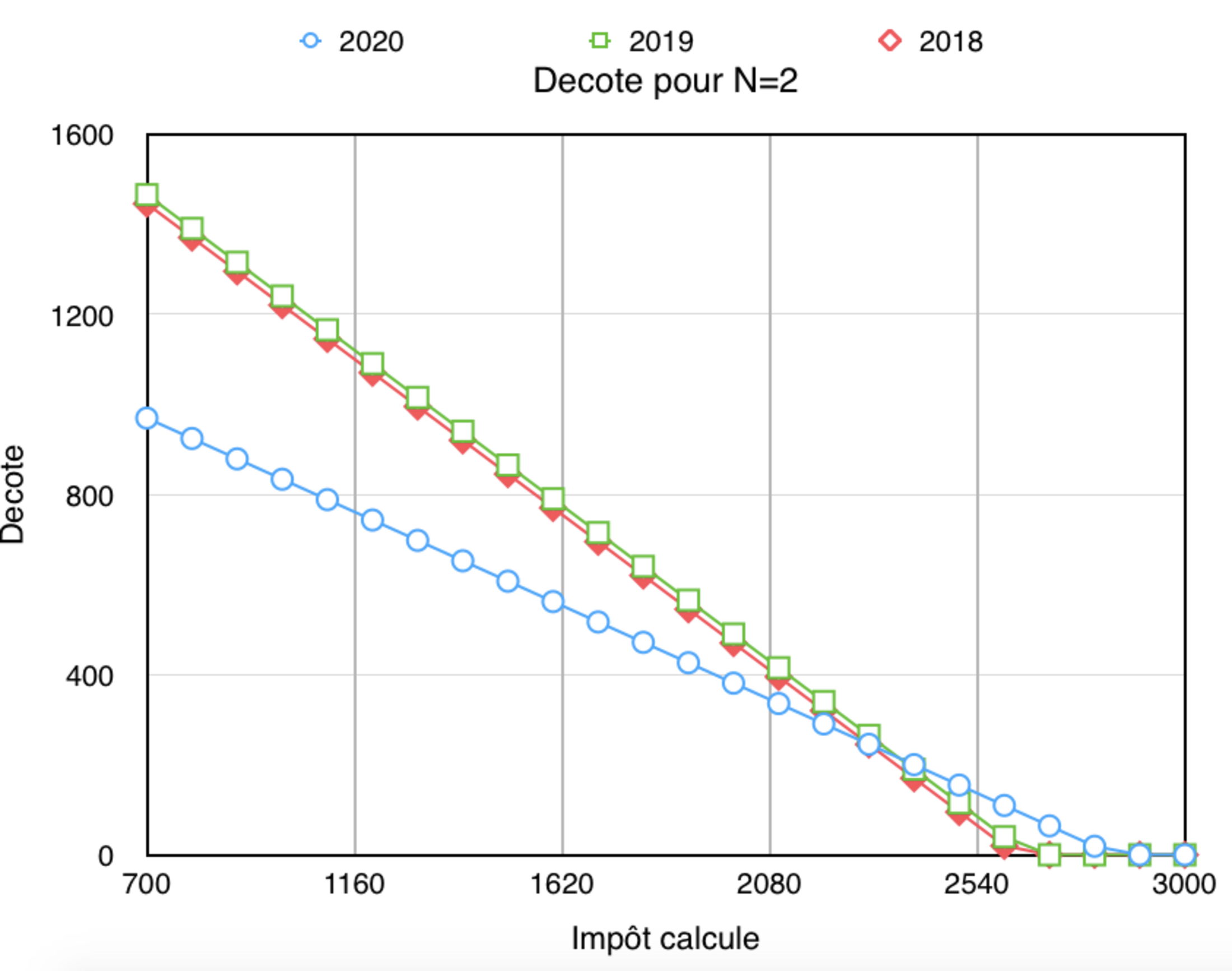 Pour un Couple, la décote 2020 sera plus faible pour un impôt calculé inférieur à 2 300 € environ. Par contre l’assiette de la décote sera plus large.