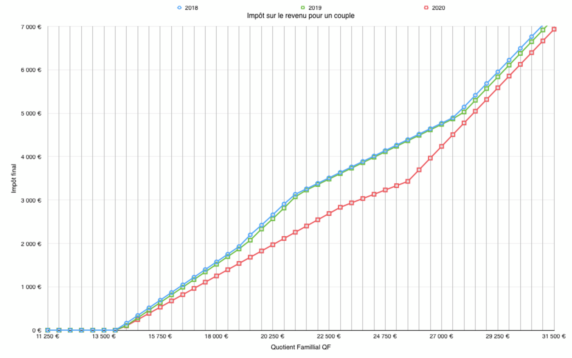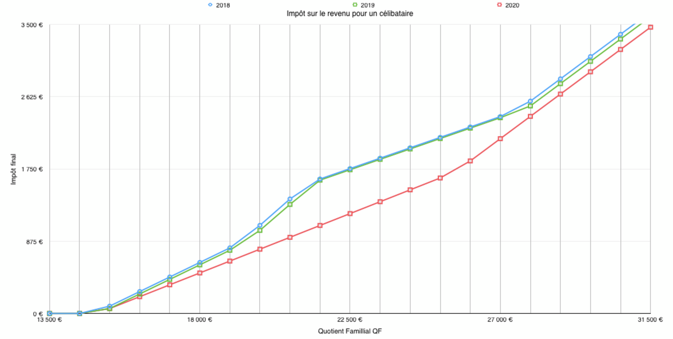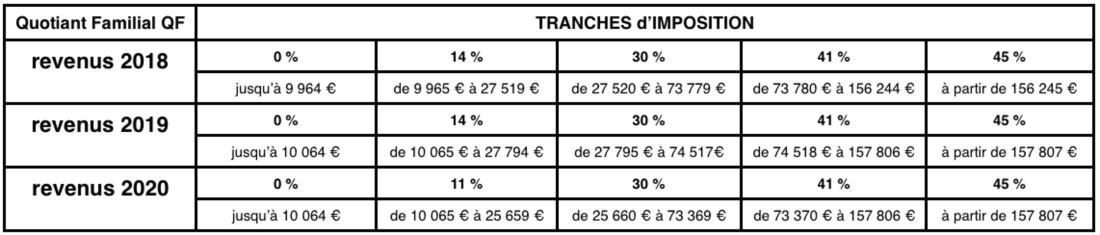 En faisant des essais avec cette calculette pour un célibataire et un couple sans enfants, je trouve qu’elle donne de bons résultats jusqu’à un quotient familial QF inférieur à 25 659 €. En effet le seuil choisi pour la tranche 30% est 27 794 € (pour les revenus 2019) au lieu de 25 659 € (pour les revenus 2020).
