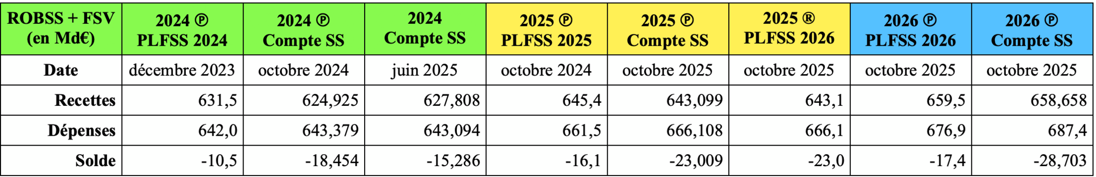 En octobre 2025, la commission des comptes de la Sécurité Sociale [3], révisait le déficit à -23,0 milliards d’euros.