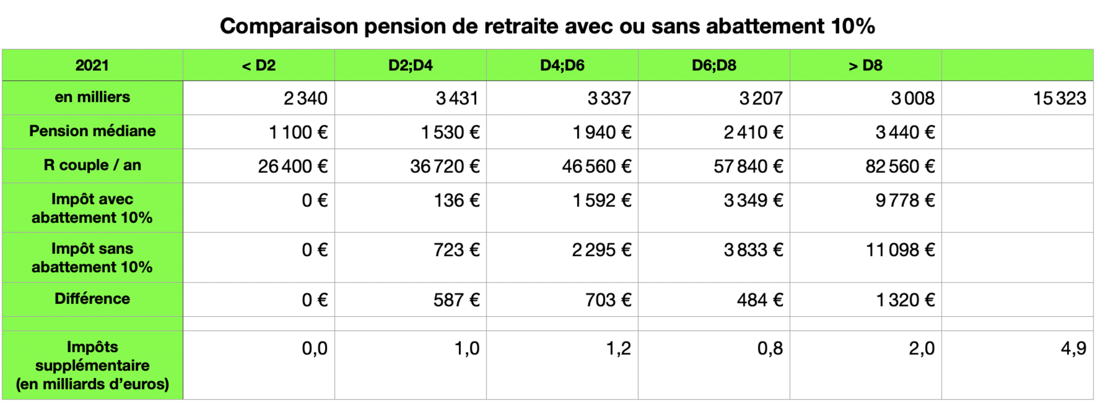 Selon le rapport 2024 de la DRESS, la répartition des 15,3 millions de retraités par déciles pourrait rapporter 4,9 milliards d’euros d’impôt supplémentaire (hypothèse faite sur des couples de retraités), en supprimant l’abattement de 10% pour les retraités. Dans les médias on voit courir le chiffre de 4 milliards d’euros.