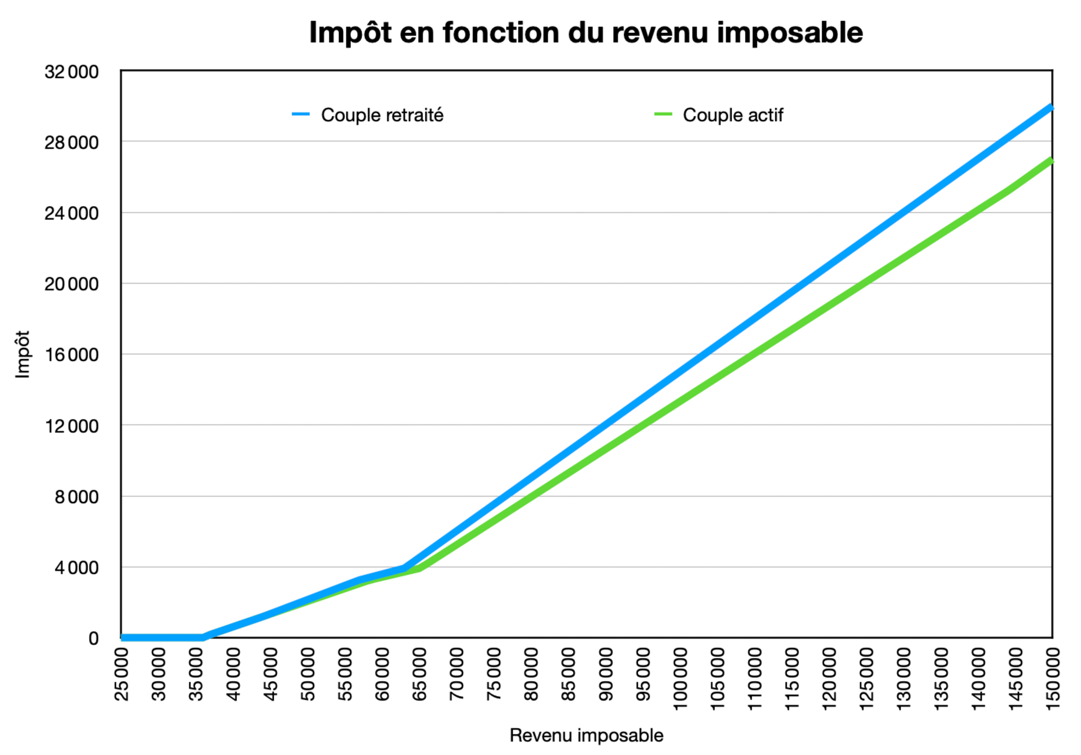Et plus les revenus imposables augmentent, plus la différence entre les retraités et les actifs est importante, pour atteindre presque 7 000 €, pour un revenu imposable de 150 000 €.