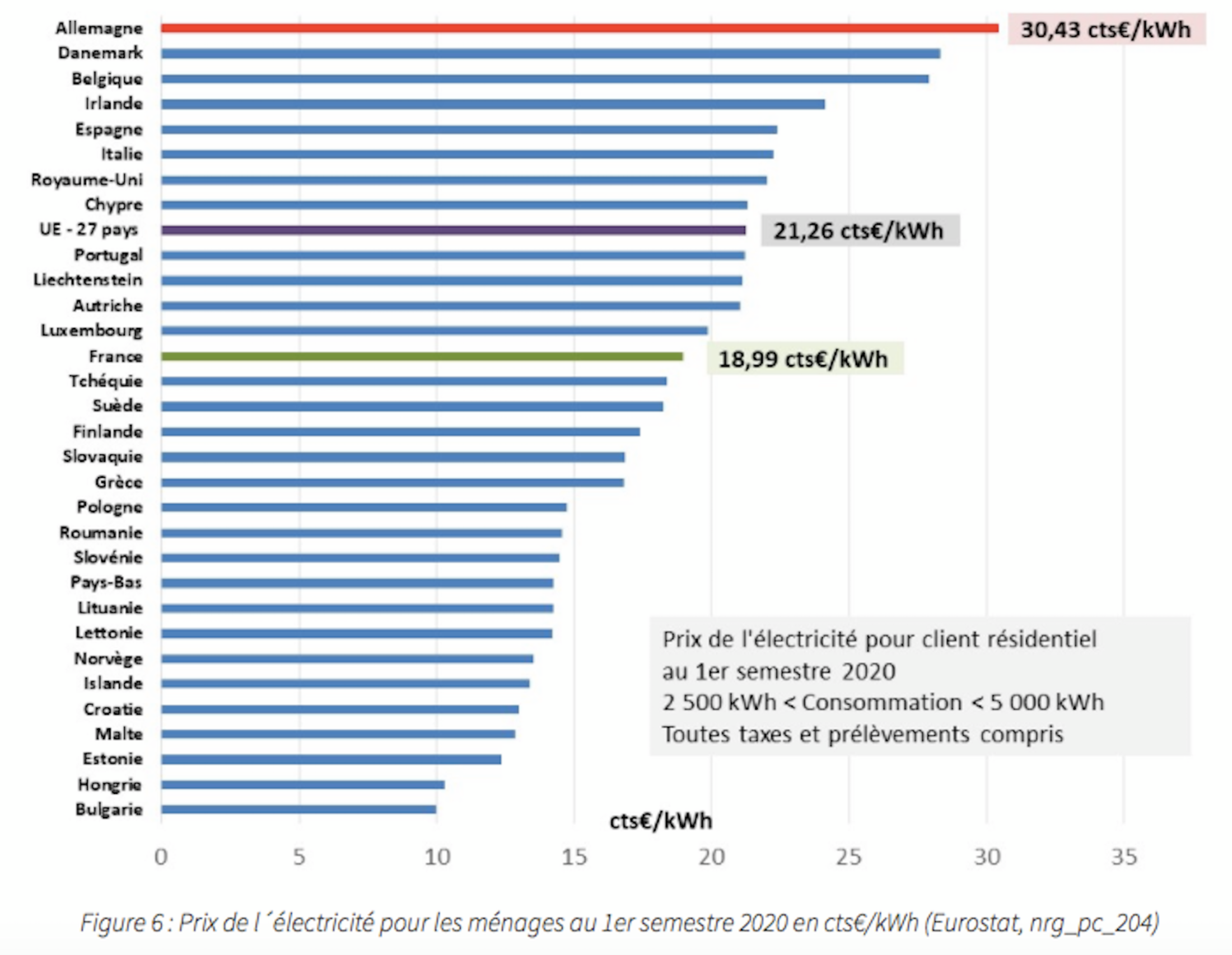 L’Allemagne a le prix de l’électricité la plus élevé de l'EU, avec 30,43 cts€ / kWh.