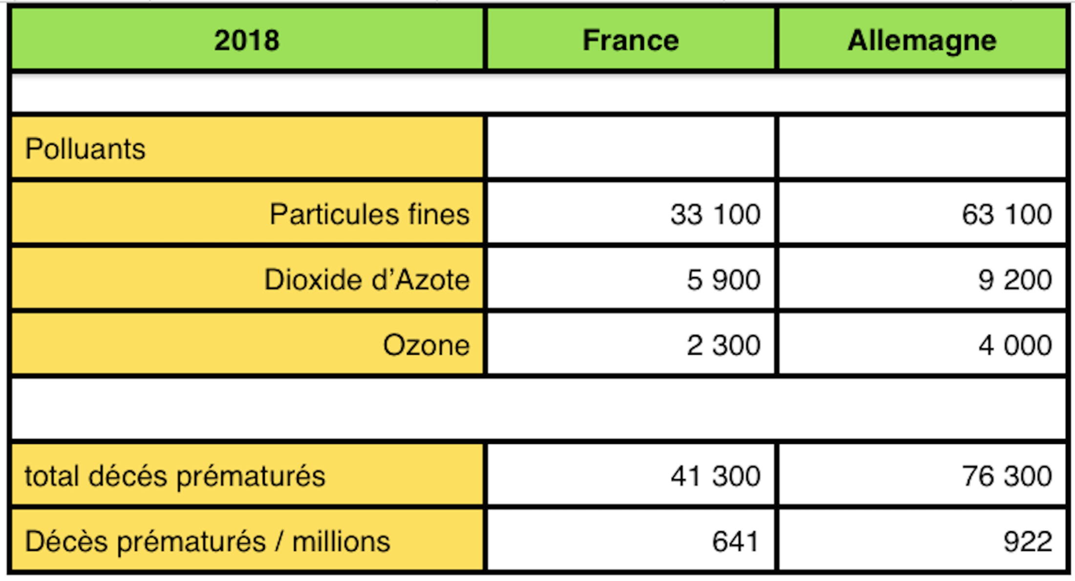 Selon les statistiques l’Agence Européenne de l’Environnement [4], le taux de mortalité du à la pollution atmosphérique en 2018 est 40% plus élevé en Allemagne qu’en France :