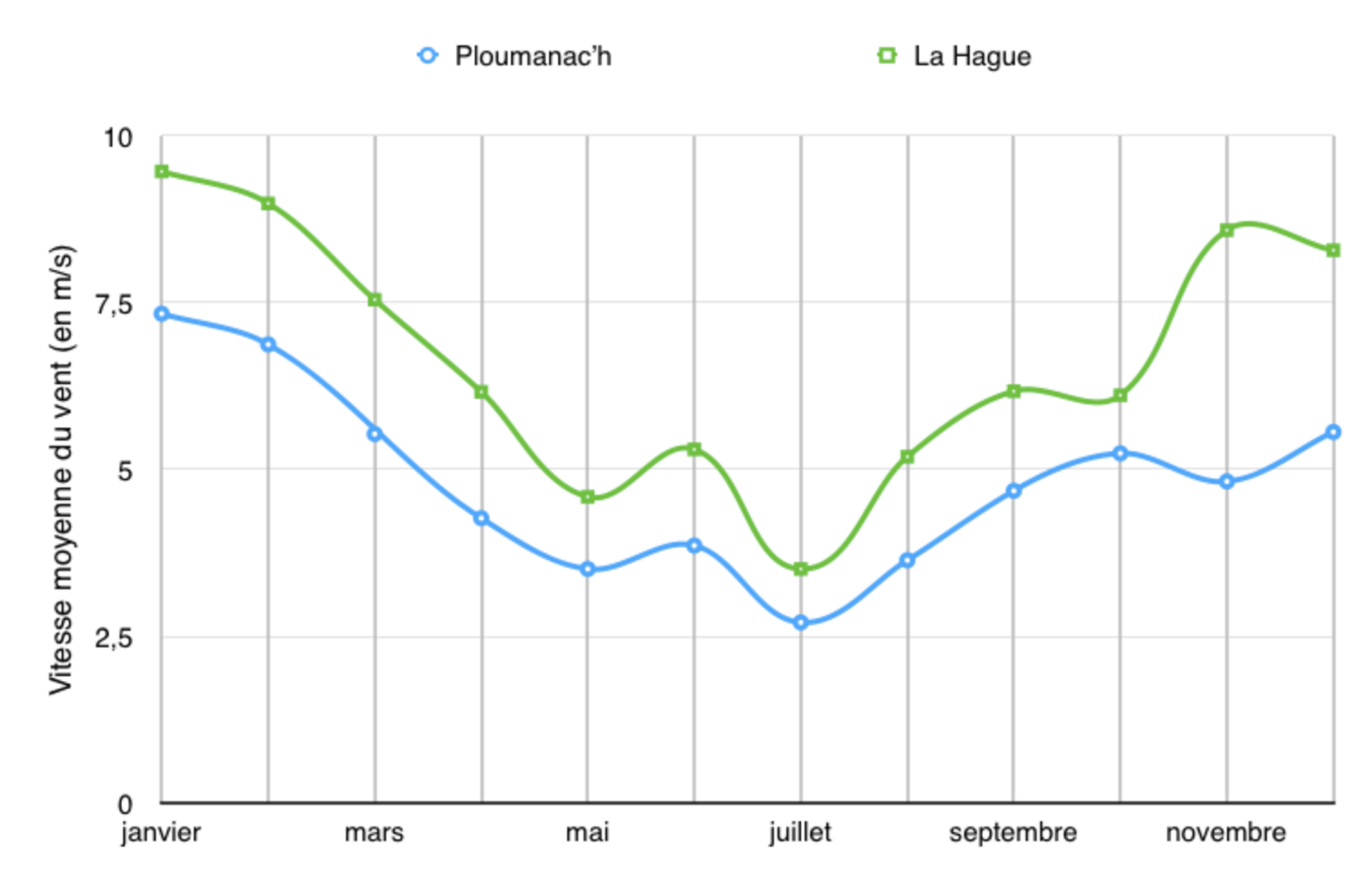 En se basant sur l’Observation météorologique historique de météo France de deux lieux au bord de la Manche (Ploumanac’h et la pointe de la Hague) qui donnent 8 mesures par jour de la vitesse moyenne du vent sur 10 mn, sur l’année 2018, on peut en déduire une vitesse moyenne mensuelle :