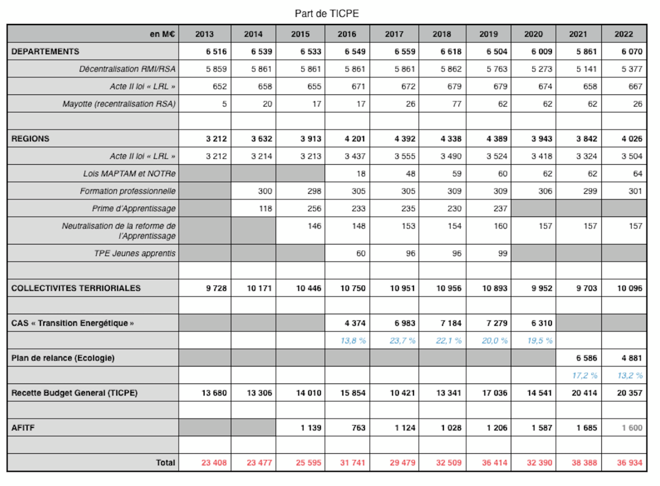 En réalité la TICPE finance les collectivités territoriales, le budget général de l’état, l’AFITF (Agence de Financement des Infrastructures de Transport de France) et la transition énergétique, comme on peut le voir dans le tableau suivant :
