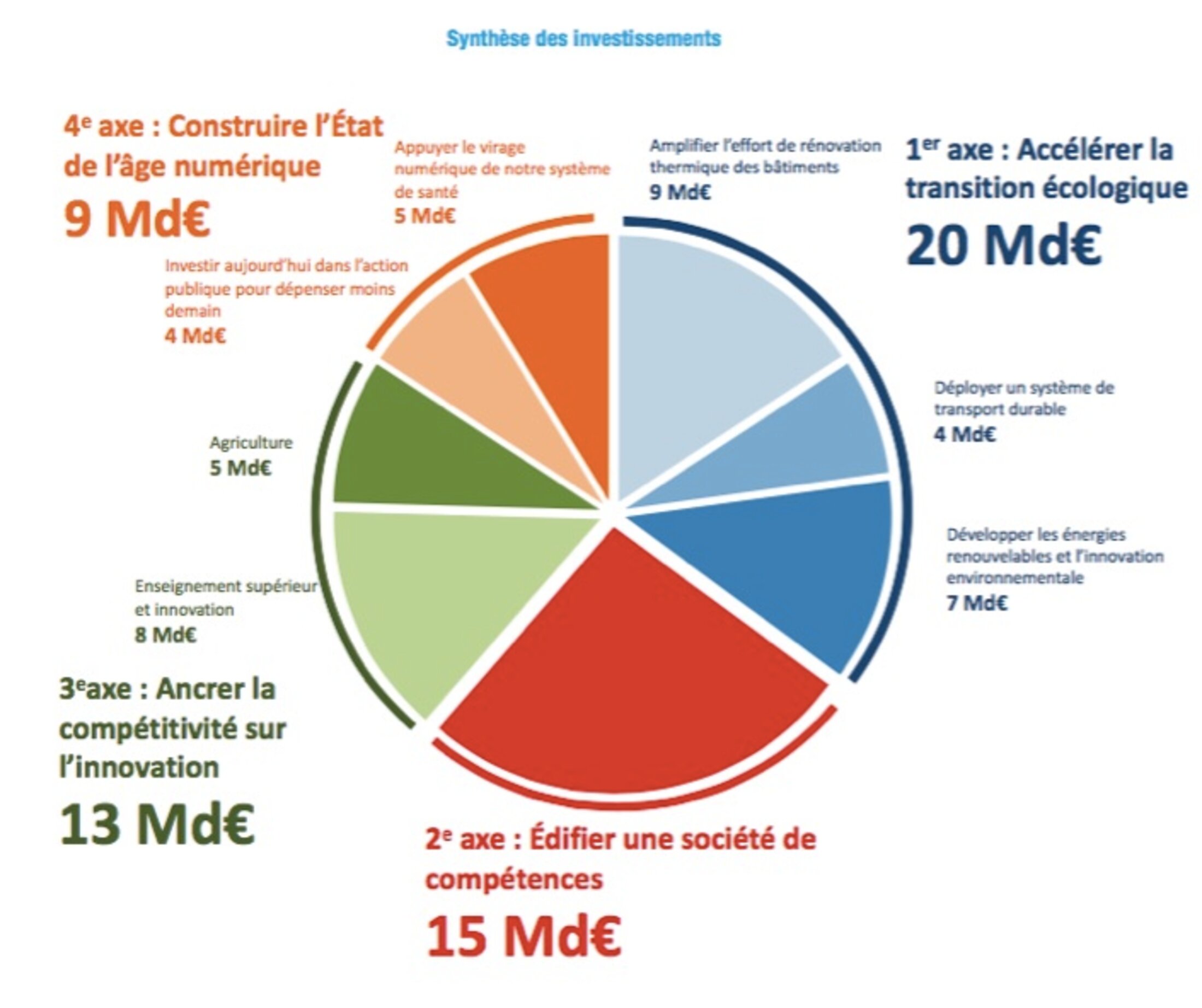 Pour y parvenir, des actions concrètes et innovantes d’investissements seront déployées dans les politiques publiques de la formation et les compétences, la transition écologique et énergétique, la santé, l’agriculture, la modernisation des administrations publiques, notamment grâce à la numérisation, les transports et équipements collectifs locaux et, enfin, l’enseignement supérieur, la recherche, les grands défis et l’innovation. Afin d’engager la transformation de notre modèle de croissance, le Grand Plan d’Investissement montera rapidement en charge dès 2018.
