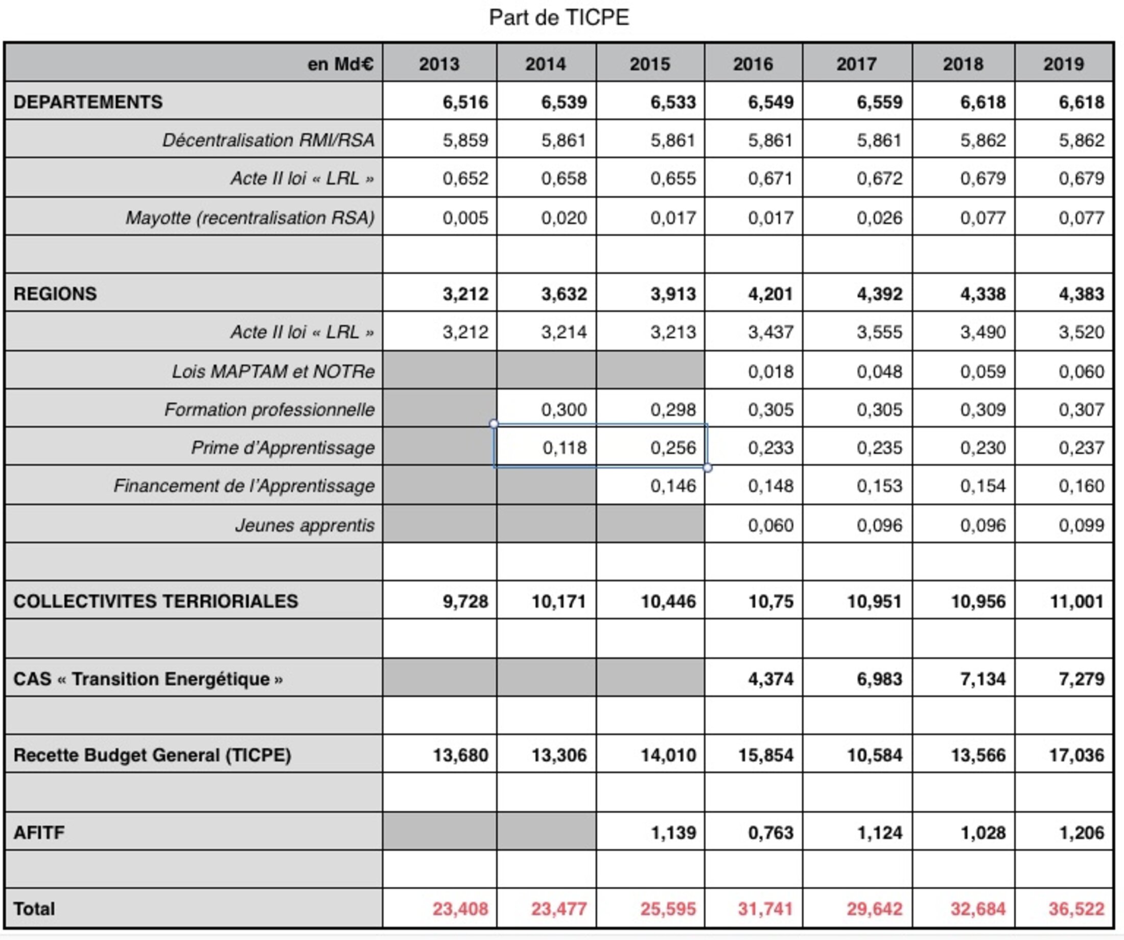 Dans le tableau ci-dessous les données concernant la part de la TICPE attribuée aux Collectivités Territoriales sont issues du livre Jaune 2019 :