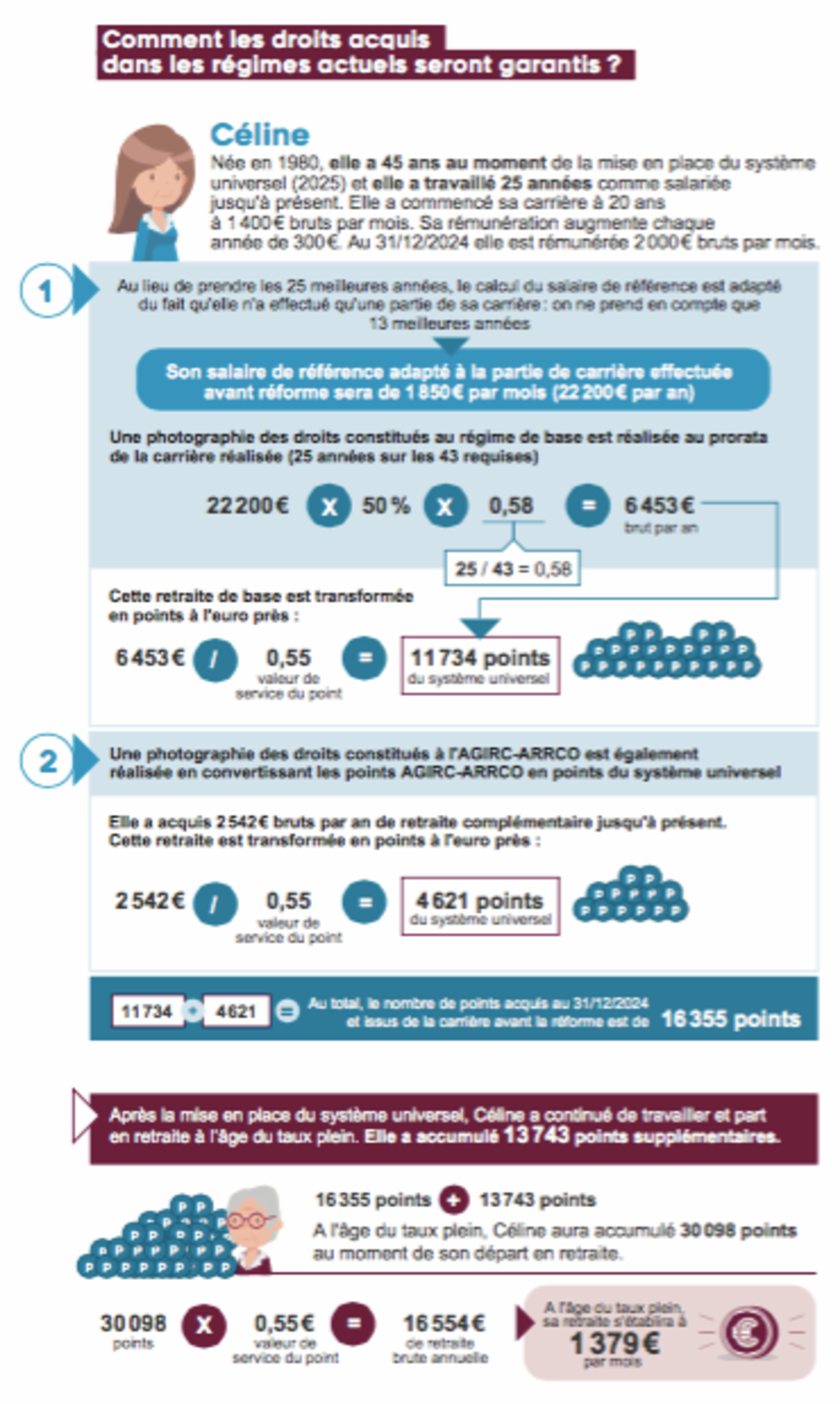 Dans le système Universel, l’âge sans décote est fixé à 64 ans, soit 44 années de cotisation pour Celine, qui a commencée à travailler à 20 ans.