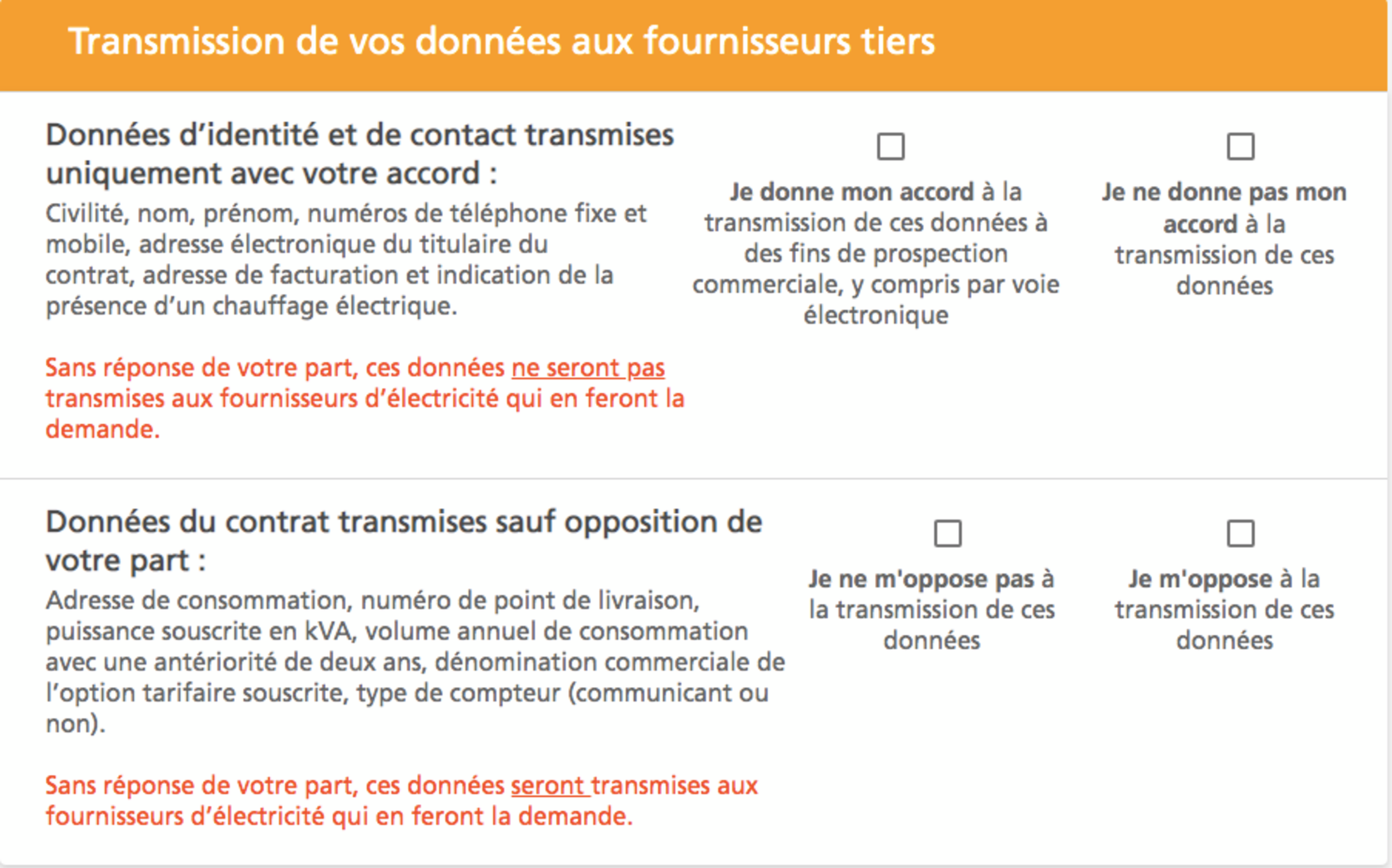 C’est la raison pour laquelle EDF demande, après avoir été sanctionné de 300 millions d’euros, à ses clients au TRV (Tarif Réglementé de Vente) de se positionner sur la transmission de leurs données personnelles suivantes :