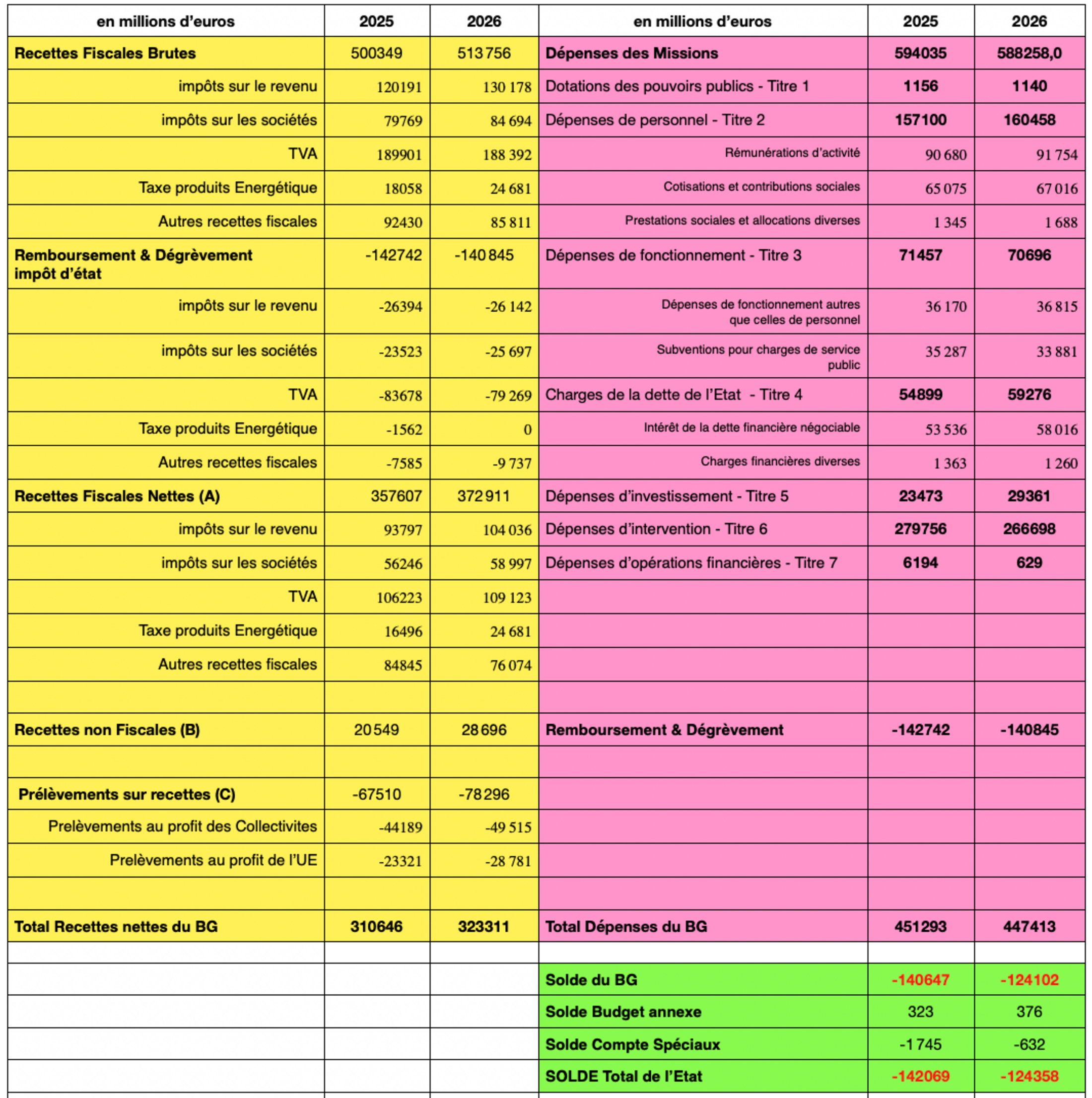 Dans le PLF 2026 initial du 14 octobre 2026, la répartition des recettes et dépenses, par rapport à 2025 sont les suivantes :