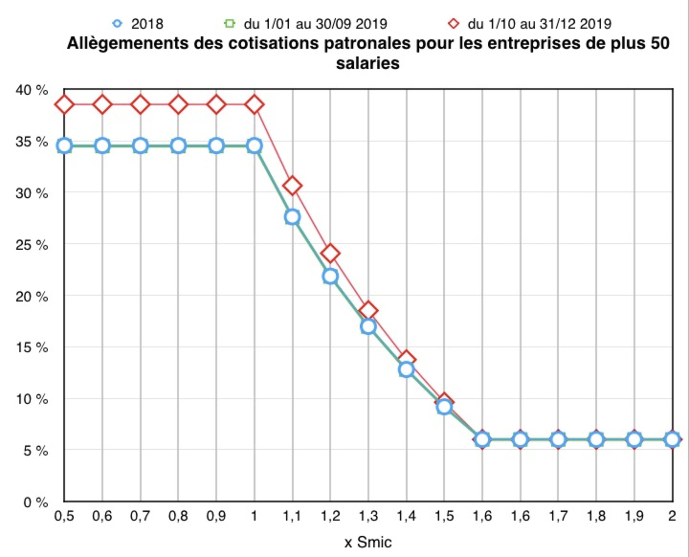 Au niveau du Smic l’allègement des cotisations patronales sera de 38,54%, pour une entreprise de plus de 50 salariés, au quatrième trimestre 2019, soit 586,28 € mensuel sur un Smic brut mensuel de 1 521,22 €.