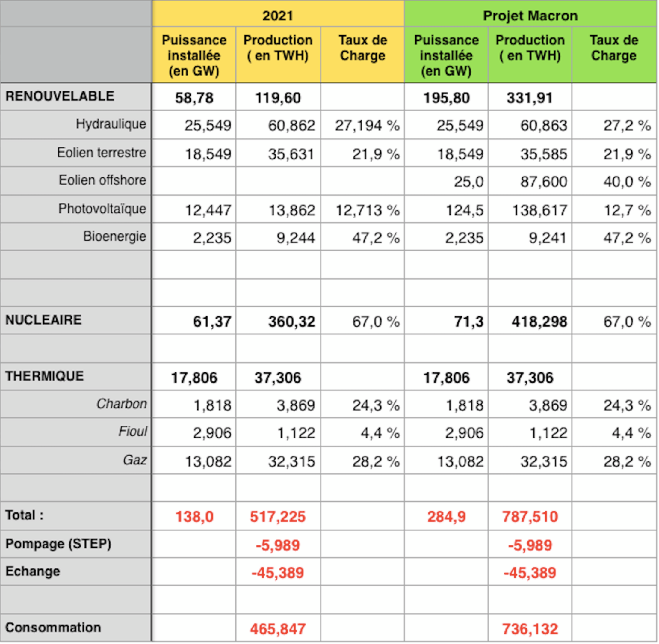Selon le rapport SNBC (Stratégie Nationale Bas-Carbone) la consommation d’énergie serait de 1060 TWh en 2050, dont 60% en énergie électrique, soit 645 TWh. Le programme de Macron prévoit près de 100 TWh de consommation électrique que le SNBC.