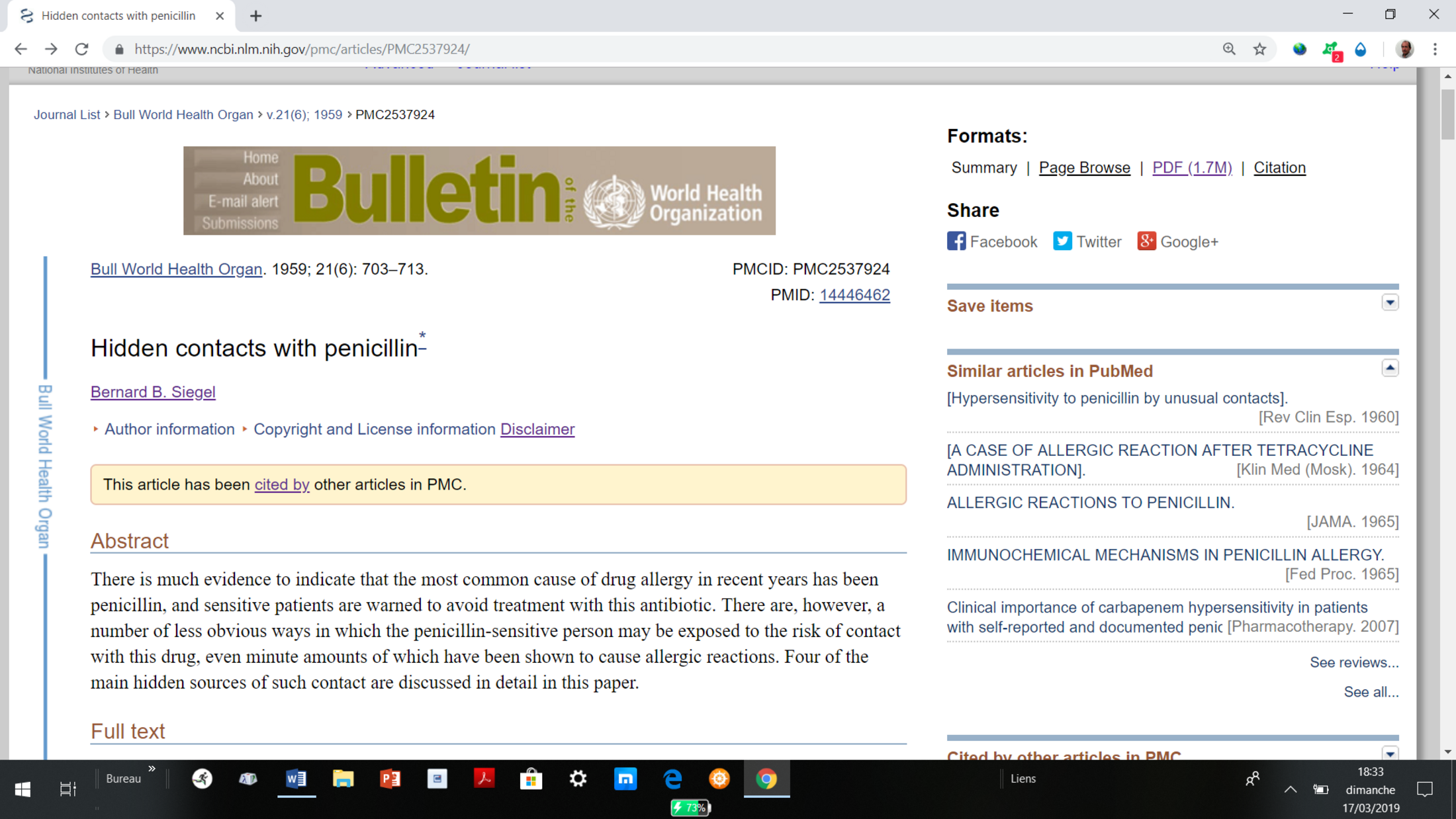 Le résumé en français montre bien les sources cachées de pénicilline pour les lecteurs francophones, présence dans le lait et dans les vaccins contre la poliomyélite alors que le risque professionnel d’inhalation de pénicilline et l’usage de seringues contaminées par la pénicilline étaient aussi d’actualité à cette époque.
