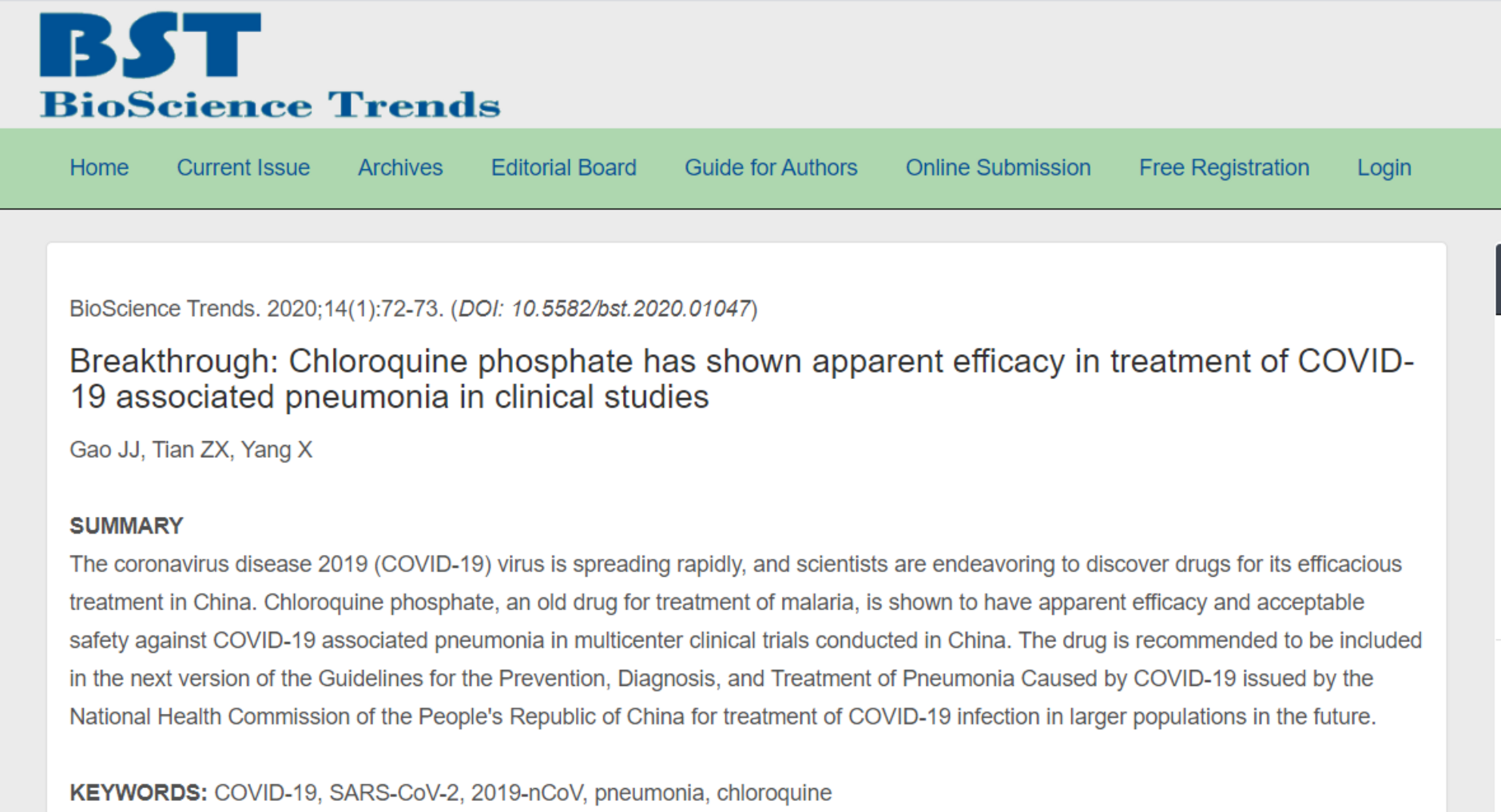 Les scientifiques et chercheurs chinois viennent de publier ce 16 mars 2020 dans la revue BioScience Trends l'évidence de l'efficacité du phosphate de chloroquine pour le traitement des infections virales par le COVID-19 et notamment les pneumonies associées. Voici leur conclusion traduite de l'anglais en français:
