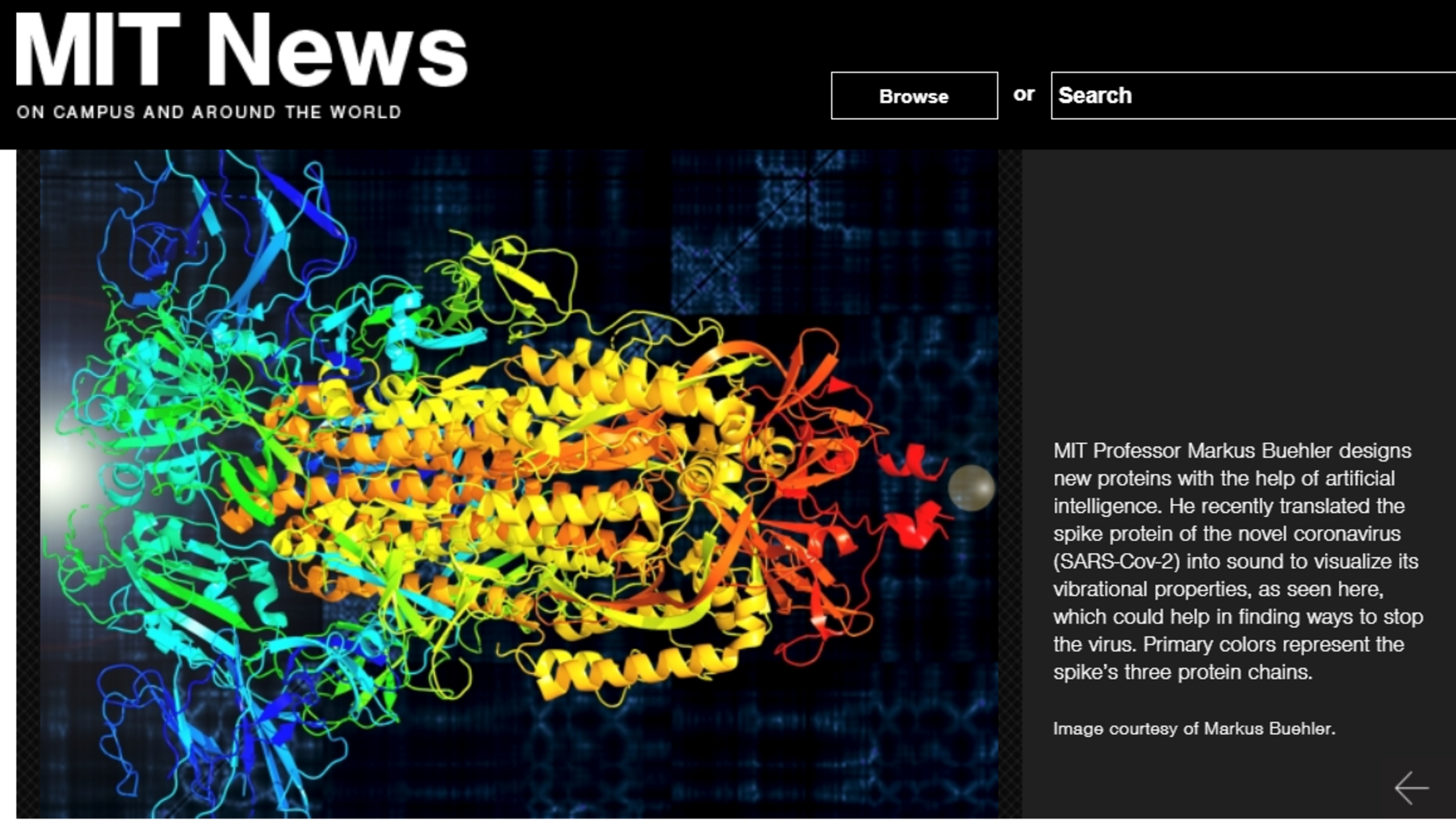 "Le professeur Markus Buehler du MIT conçoit de nouvelles protéines à l’aide de l’intelligence artificielle. Il a récemment traduit la protéine spike du nouveau coronavirus (SARS-Cov-2) en son pour visualiser ses propriétés vibratoires, comme on le voit ici, ce qui pourrait aider à trouver des moyens d’arrêter le virus. Les couleurs primaires représentent les trois chaînes protéiques spike. Markus Buehler sur la mise en musique de coronavirus et de protéines inspirées de l'IA. Traduit en son, le SRAS-CoV-2 trompe notre oreille de la même manière que le virus trompe nos cellules."