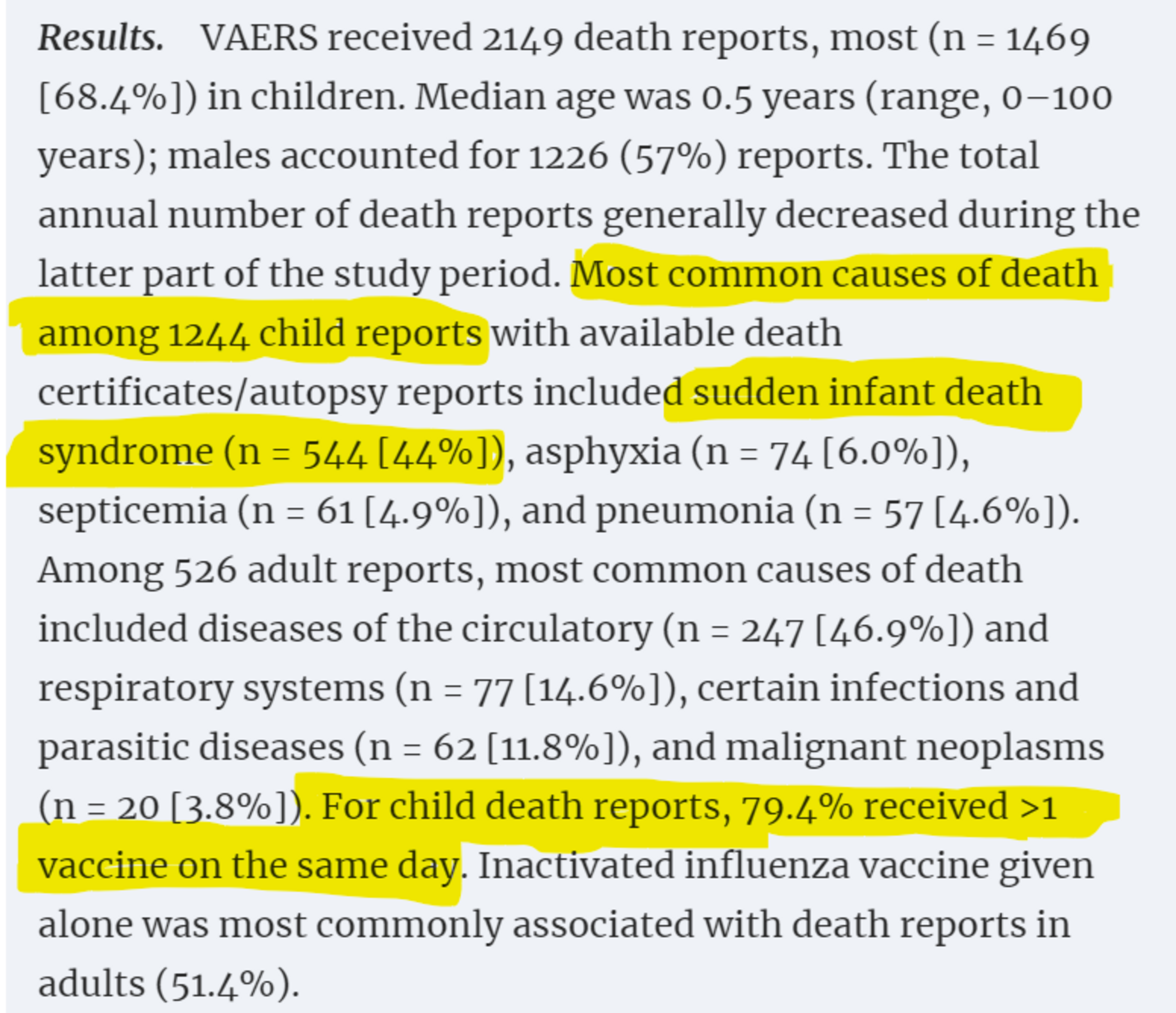 Ce qui est clair en anglais et encore plus clair en français… : « Causes de décès les plus courantes parmi 1244 rapports d'enfants, syndrome de mort subite du nourrisson (n = 544 [44%]), pour les déclarations de décès d’enfants, 79,4% ont reçu> 1 vaccin le même jour ».