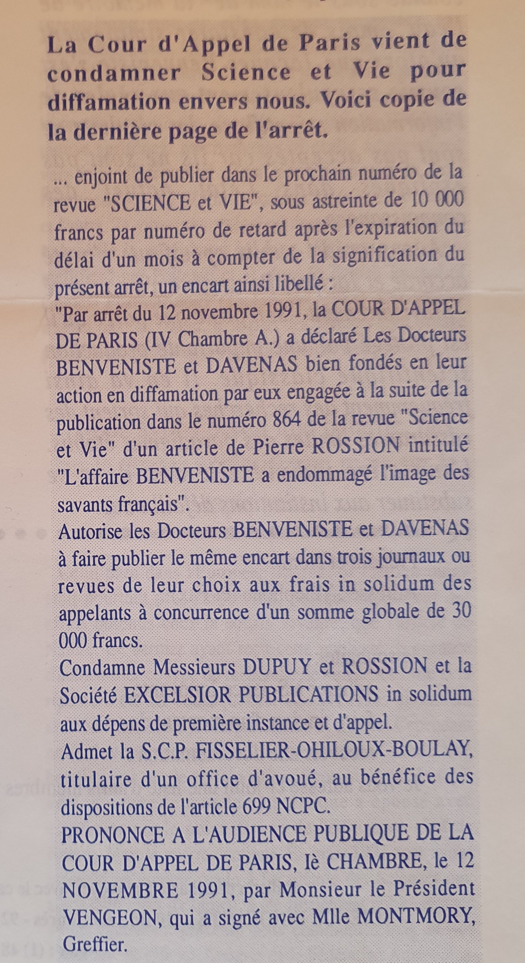Cependant, le « journaliste » Pierre Rossion de la revue « Science et Vie » fut condamné pour diffamation devant le TGI de Paris le 12 novembre 1991 !