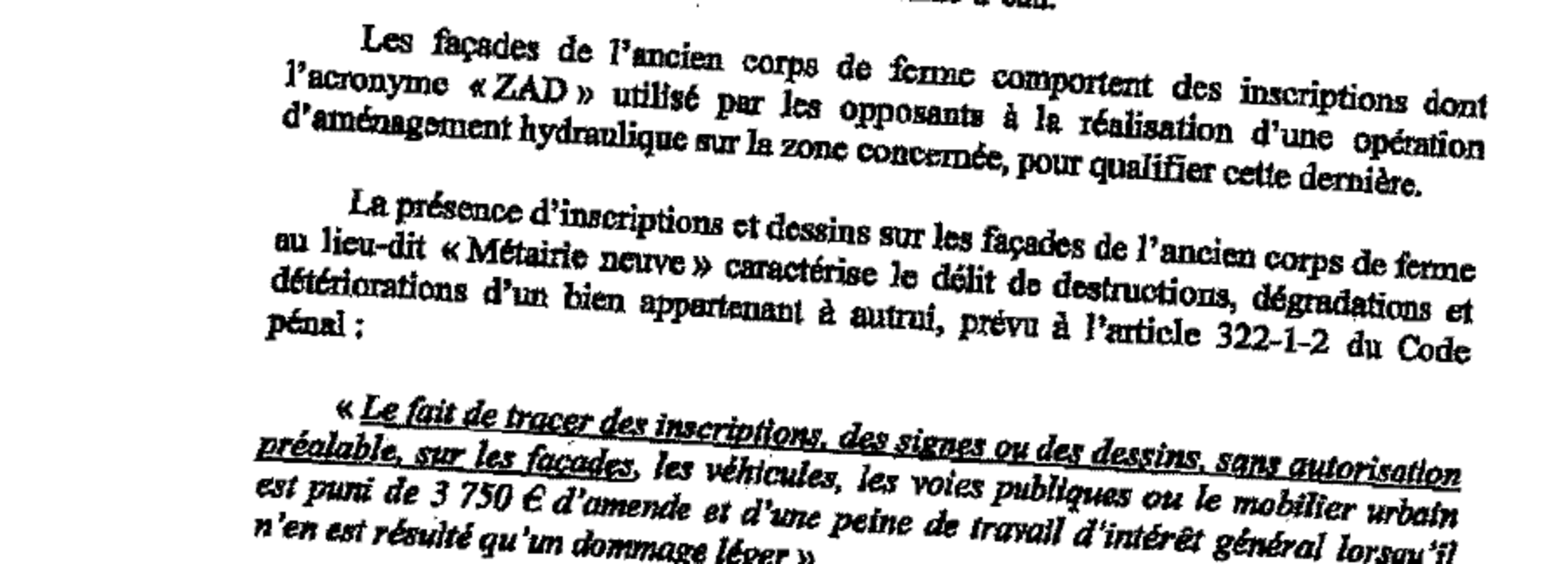Citoyennes et citoyens, qui faites l’effort de lire ce petit blog de combat, vous pourrez en déduire ce me semble que, même pour le procureur Dérens, si les bâtiments ont été délibérément rasés par Carcenac juste après l’incendie, ce n’était plus possible pour Carcenac de poursuivre les incendiaires ou les zadistes qui les avaient couverts de graffitis. De fait, il n’y avait plus aucun intérêt à le faire. Comme il n’y a pas grand intérêt à tuer un mort.