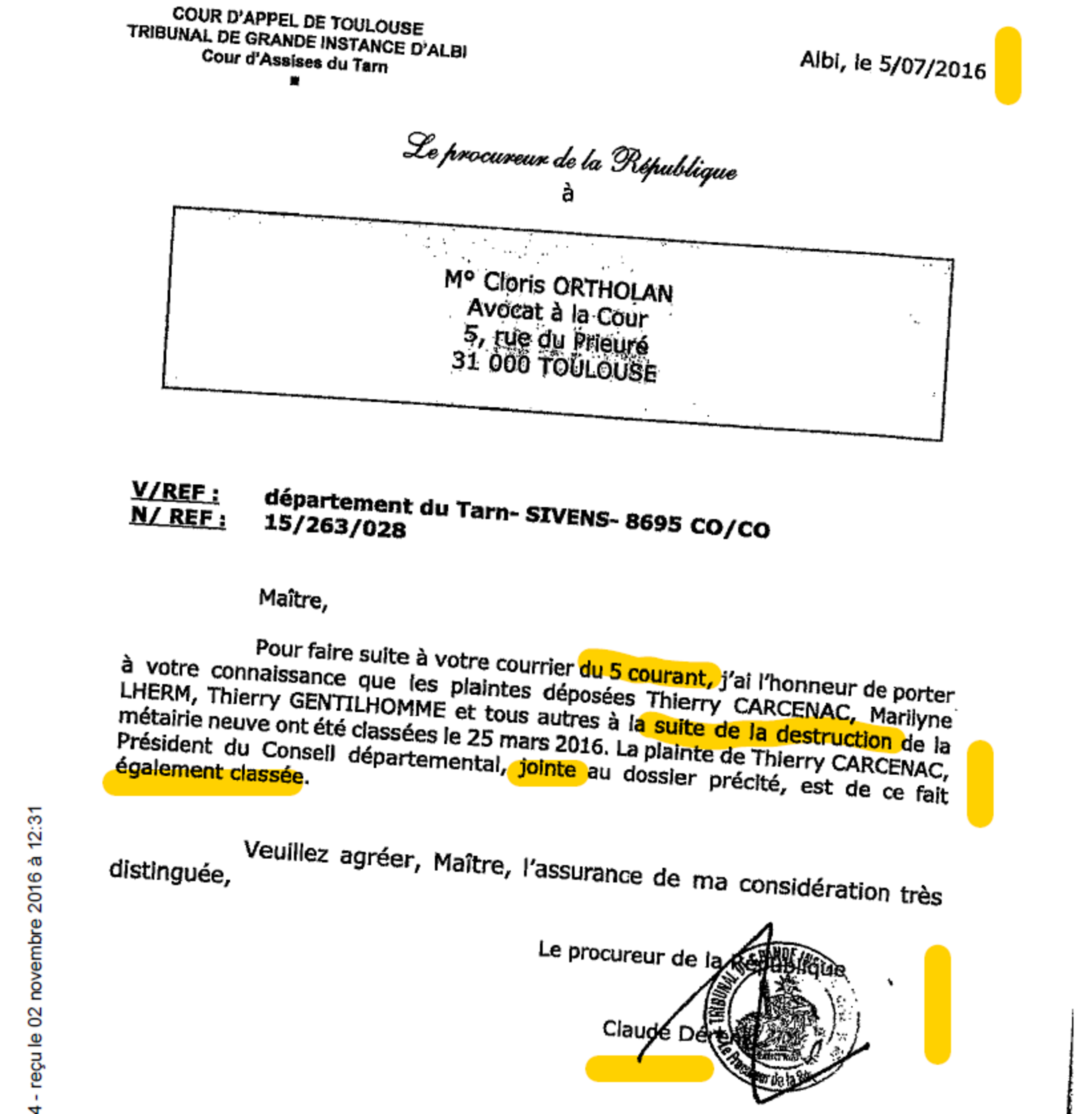 Et là, si un avocat a l’habitude d’avoir des surprises dans les procédures, je dois dire que j’ai été servi, ainsi que ma consœur au Conseil d’Etat : l’avocat du département ayant demandé un justificatif du classement sans suite de la plainte de Carcenac le 5 juillet 2016, le procureur Dérens a complètement perdu les pédales : il s’est rendu compte qu’il n’avait jamais informé le département du classement sans suite de l’affaire liée à l’incendie et il a répondu… le jour même ! par une lettre stupéfiante, sans se douter une seconde que cette lettre stupéfiante allait nous être communiquée par Thierry Carcenac himself pour se défendre par tous moyens devant le Conseil d’Etat, comme on va le voir, au mépris de tout code d’honneur en usage dans toute mafia qui se respecte.