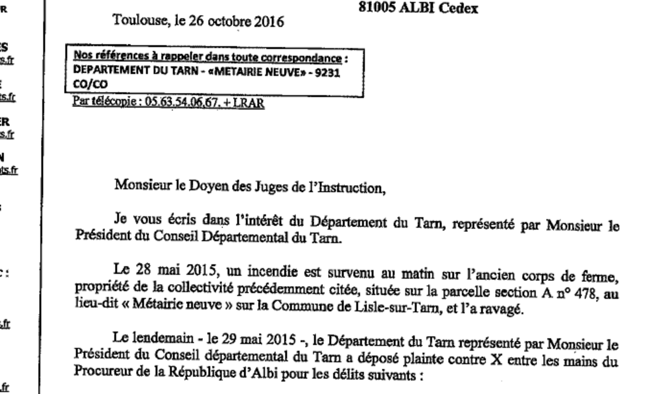 Or, Thierry Carcenac, individu à ce jour au-dessus des lois, a eu le culot d’indiquer par écrit, dans sa plainte avec constitution de partie civile du 26 octobre 2016… qu’il n’y avait pas eu suffisamment d’investigations après l’incendie volontaire du jeudi 28 mai 2015 !