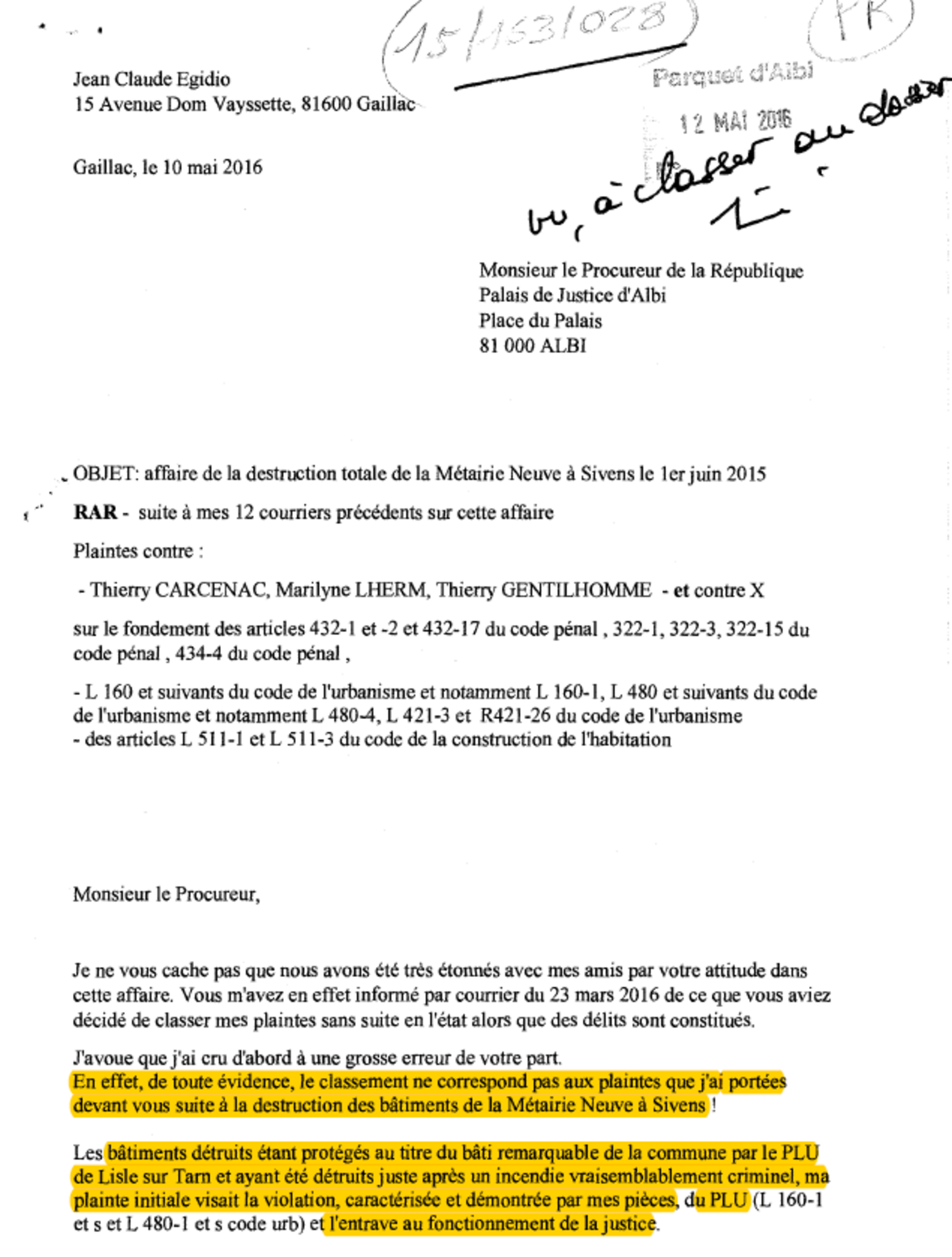 Mais avant de le publier, pour faire suite à l’épisode précédent qui évoquait la lettre édifiante de Thierry Carcenac, datée du 13 mars 2015, dans laquelle il indiquait sa volonté et celle du préfet de raser la Métairie Neuve de Sivens, je publie dans son intégralité la lettre de Jean Claude Egidio au procureur Dérens, enregistrée par le parquet d’Albi le 12 mai 2016, telle que nous la retrouverons au dossier d’enquête inénarrable du procureur Dérens en janvier 2017 (la signature Z est celle de Claude Dérens…suivez mon regard).