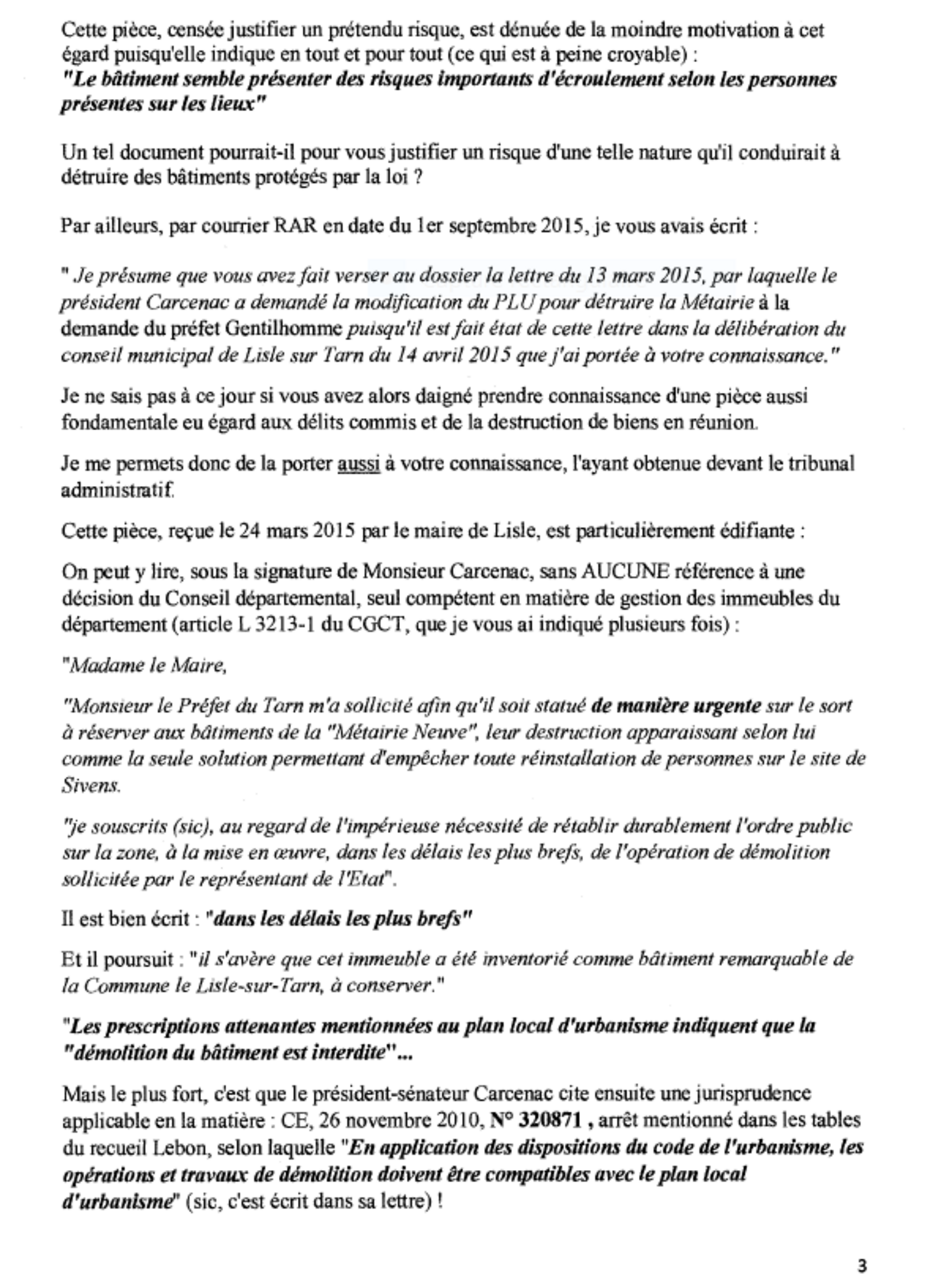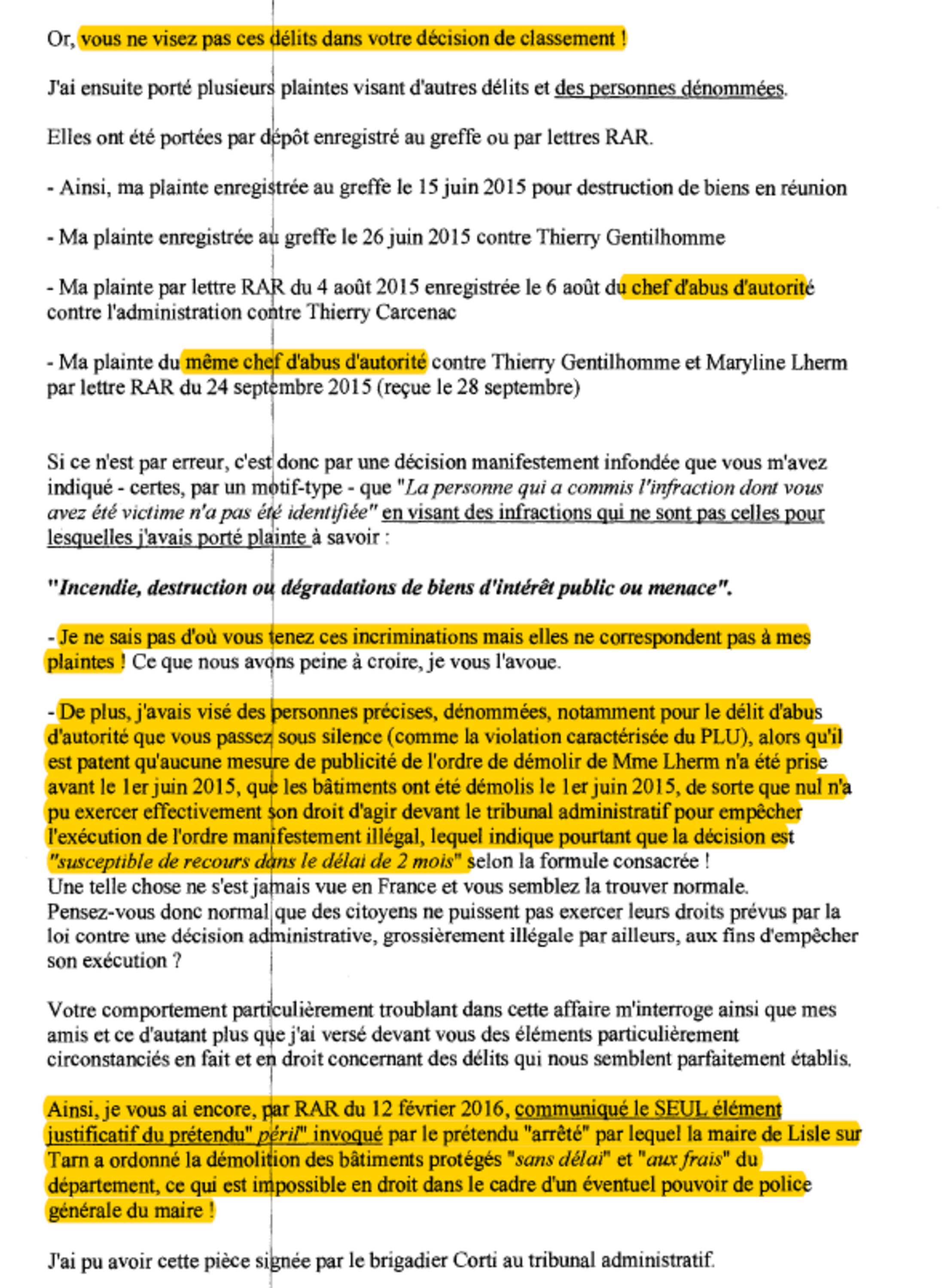 Citoyennes et citoyens, qui ferez l’effort de lire ce petit blog de combat, vous avez vu que dans tous les extraits des 13 lettres de Jean Claude Egidio au procureur Dérens que j’ai publiés, comme la lettre ci-dessus, figurait en objet : « affaire de la destruction totale de la métairie neuve de Sivens le 1er juin 2015 » ainsi que les délits visés. Aucune erreur, aucune ambigüité n’était possible. Mes amis n'ont pas porté plainte suite à l'incendie ni pour les graffitis sur la Métairie (n'ayant pas qualité pour le faire).
