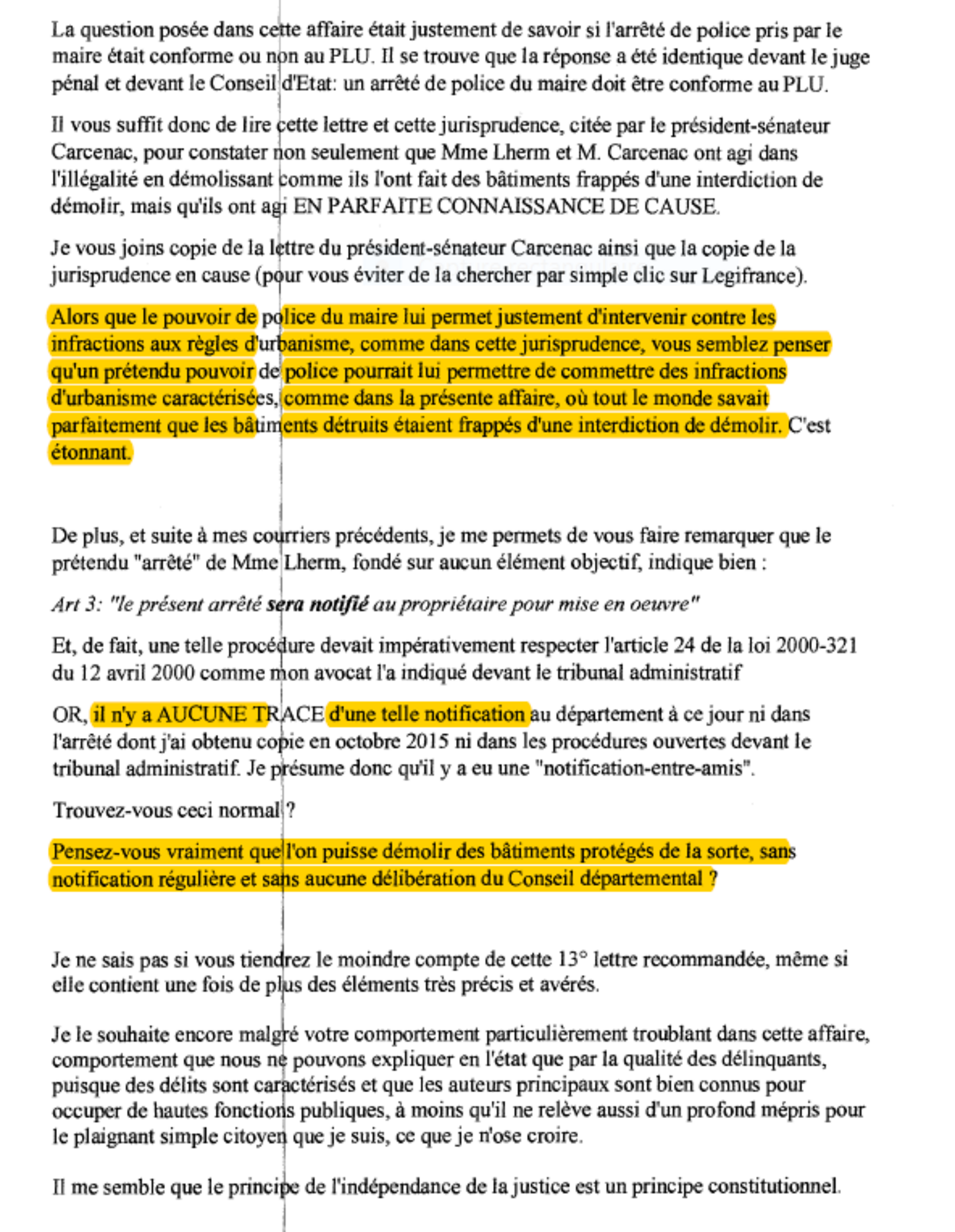 Il va de soi que la lettre de Carcenac datée du 13 mars 2015 n’avait pas été versée au dossier par Dérens, puisqu’il n’avait procédé à aucune des mesures d’enquête qui lui avaient été demandées, et pour cause !