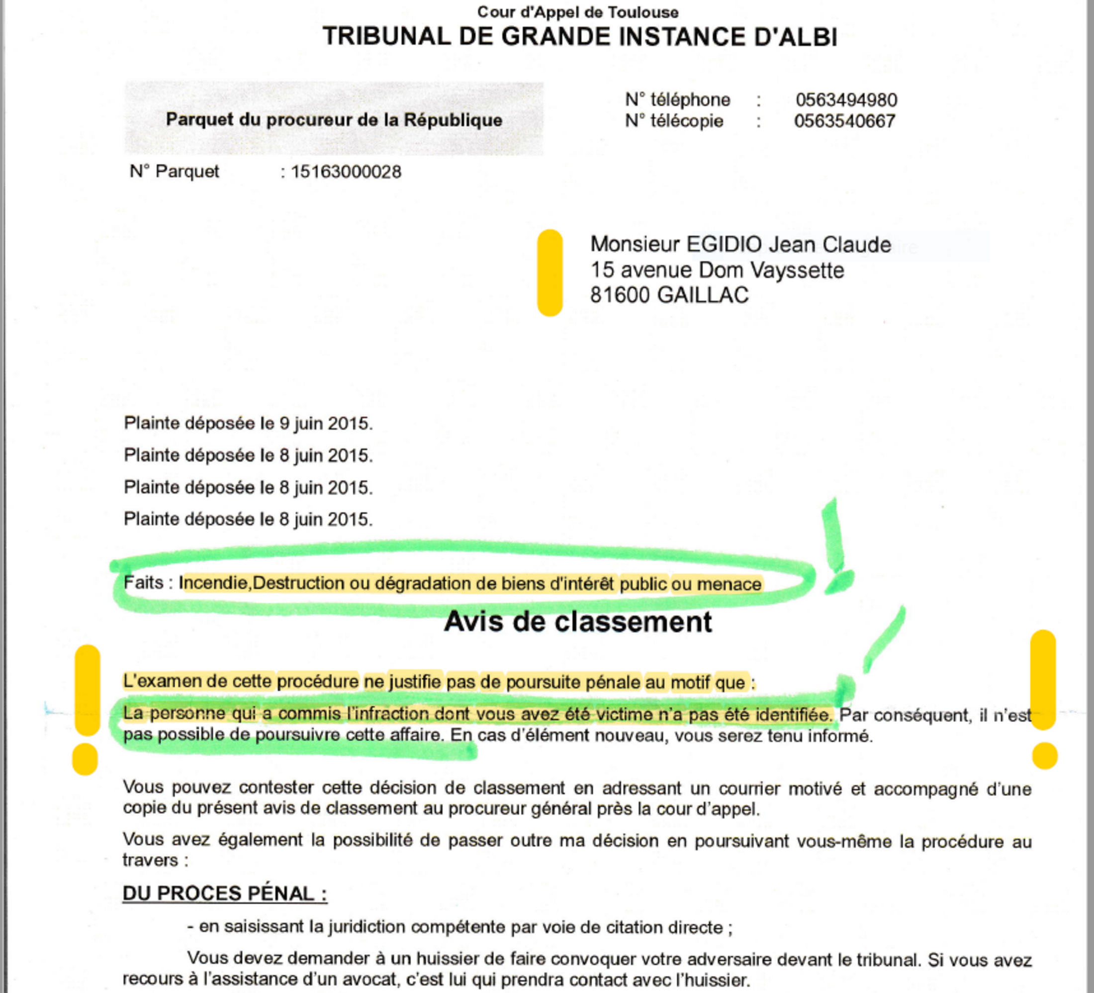Citoyennes et citoyens, JE VAIS VOUS FAIRE JUGES MAINTENANT du classement sans suite que mes amis ont reçu le 25 mars 2015, qui n’avait rien à voir – si l’on peut dire car en vérité il avait un peu trop à voir... – avec « notre » affaire. Pour la simple raison que le procureur Dérens avait mélangé les plaintes contre Carcenac et sa clique tarnaise avec la plainte de pure propagande déposée par son comparse Carcenac le lendemain matin de l’incendie, plainte qui visait, comme je l’ai dit ici, l’incendie et les graffitis.