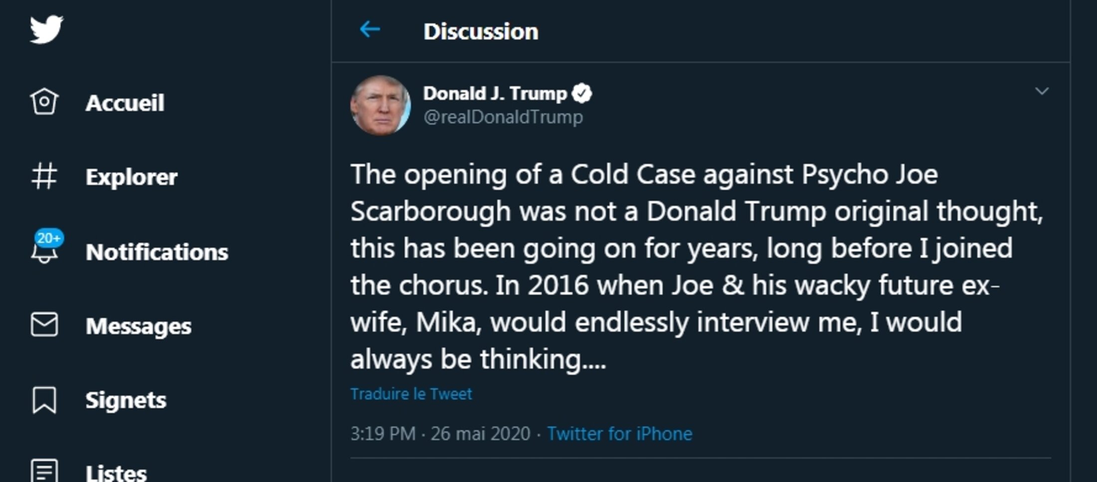 Si l’on demande pourquoi Trump attaque Joe Scarborough, la raison en est enfantine, dans tous les sens du terme. Ce dernier, avec sa compagne Mika Brzezinski, animent le show “Morning Joe” sur MSNBC. Ils n’ont pas été tendres avec Trump, l’accusant entre autres, d’avoir très mal géré l’épidémie du covid-19 qui a fait plus de 100 000 morts aux USA et ses conséquences économiques. Donald Trump se venge de ce journaliste, tout simplement.