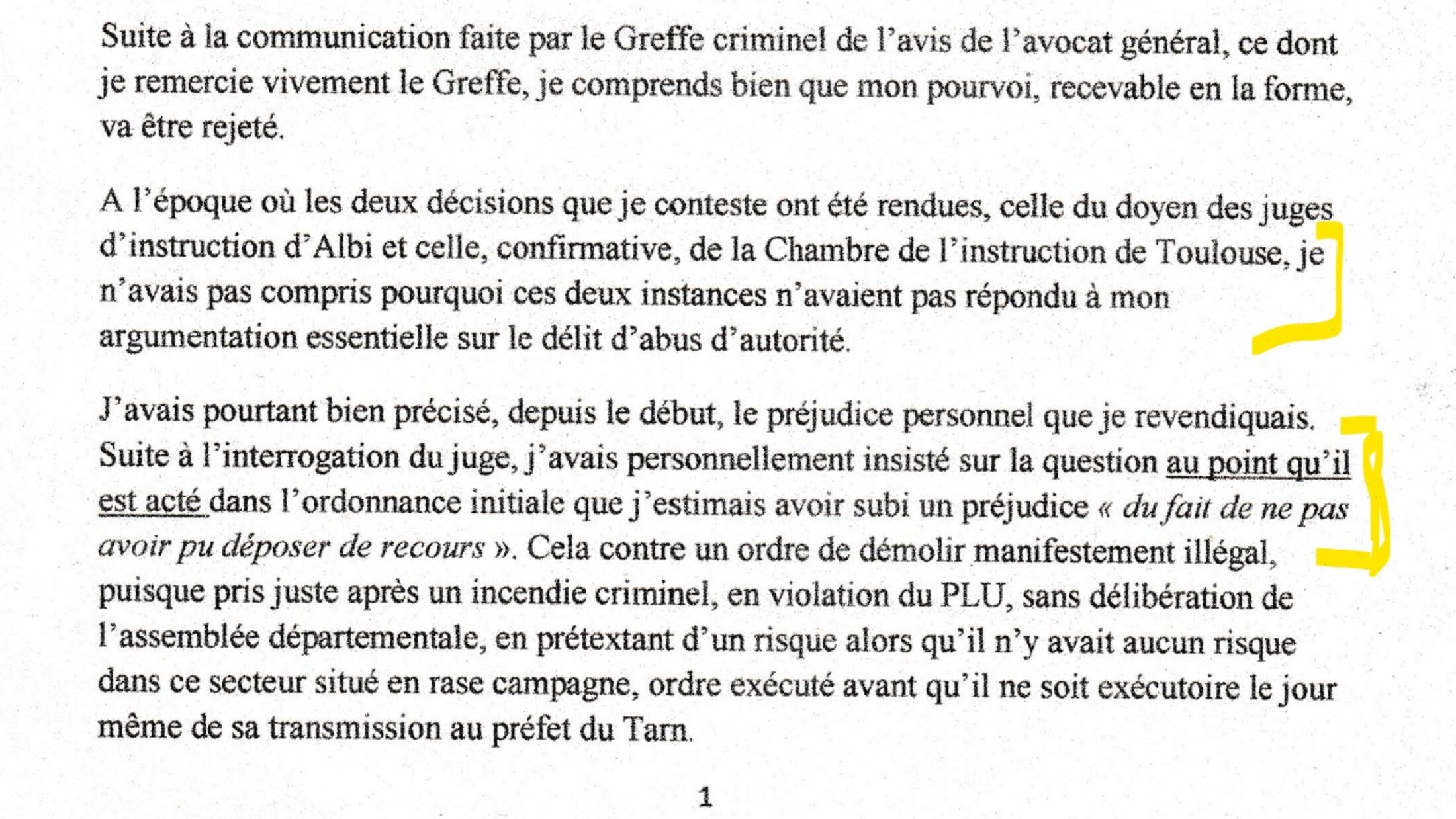 Il était allégué, pièces citées à l’appui, devant la chambre criminelle que le procureur d’Albi avait été complice des délits qui lui avaient été dénoncés et qu’il avait lui-même commis des délits dans cette affaire, ce qui expliquait le comportement erratique des magistrats qui l’avaient couvert à Albi et à Toulouse.