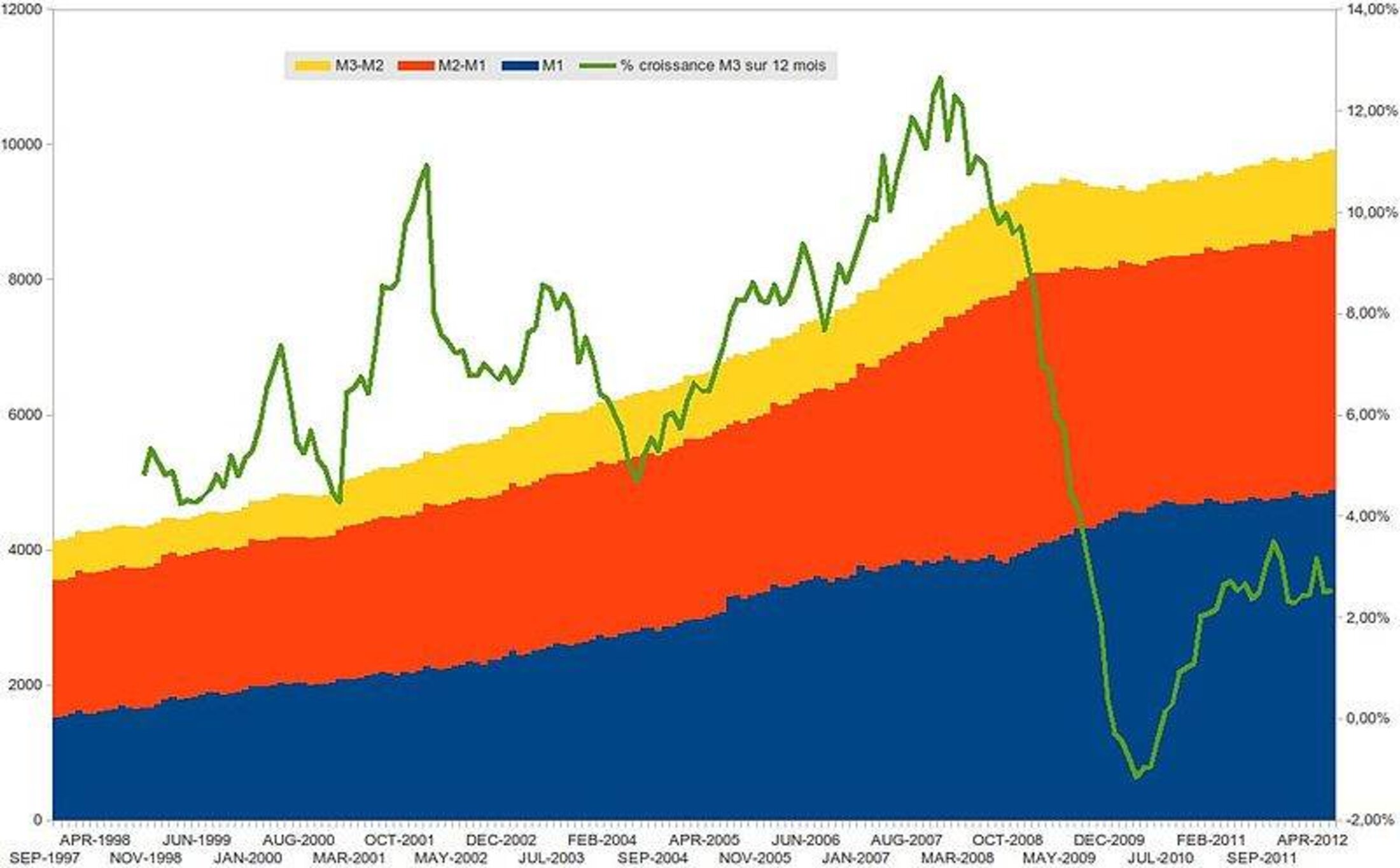 Fig 1 : D’après la BCE, la masse monétaire dans la zone Euro a augmentée d’environ 8 à 10% par an entre 2000 et 2007 (M1 correspond aux billets, pièces et dépôts à vue. M2 correspond à M1 plus les dépôts à termes inférieurs ou égaux à deux ans et les dépôts assortis d'un préavis de remboursement inférieur ou égal à trois mois (par exemple, pour la France, le livret jeune ou le CODEVI, les livrets A et bleu, le compte d'épargne logement, le livret d'épargne populaire...). M3 correspond à M2 plus les instruments négociables sur le marché monétaire émis par les institutions financières monétaires (IFM), et qui représentent des avoirs dont le degré de liquidité est élevé avec peu de risque de perte de capital en cas de liquidation (ex : OPCVM monétaire, certificat de dépôt, créance inférieure ou égale à deux ans).