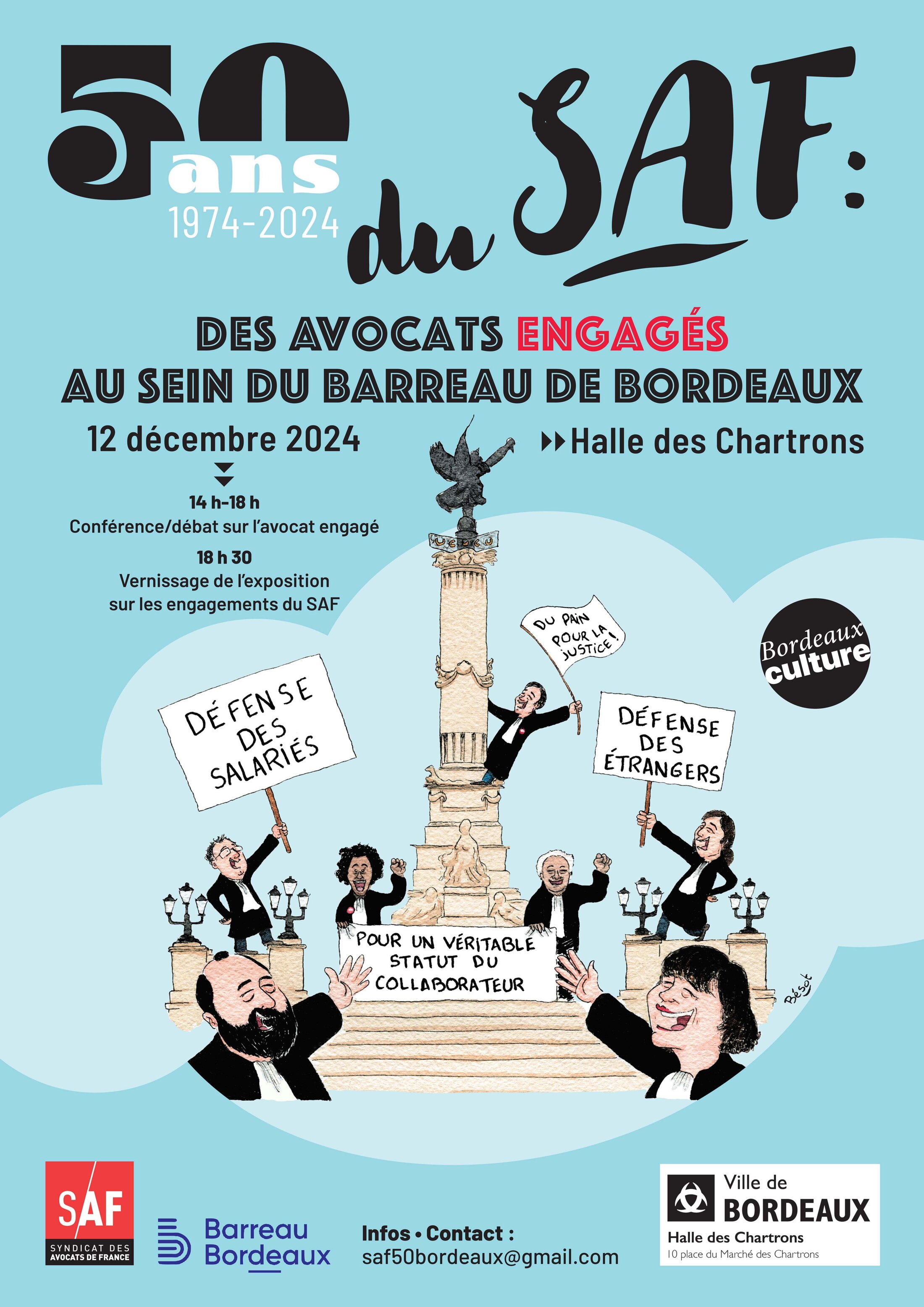 Fier et heureux d'avoir réalisé le dessin de l'affiche des 50 ans du SAF (Syndicat des Avocats de France) de Bordeaux ! (graphiste de l'affiche : ©Véronique Schiltz)