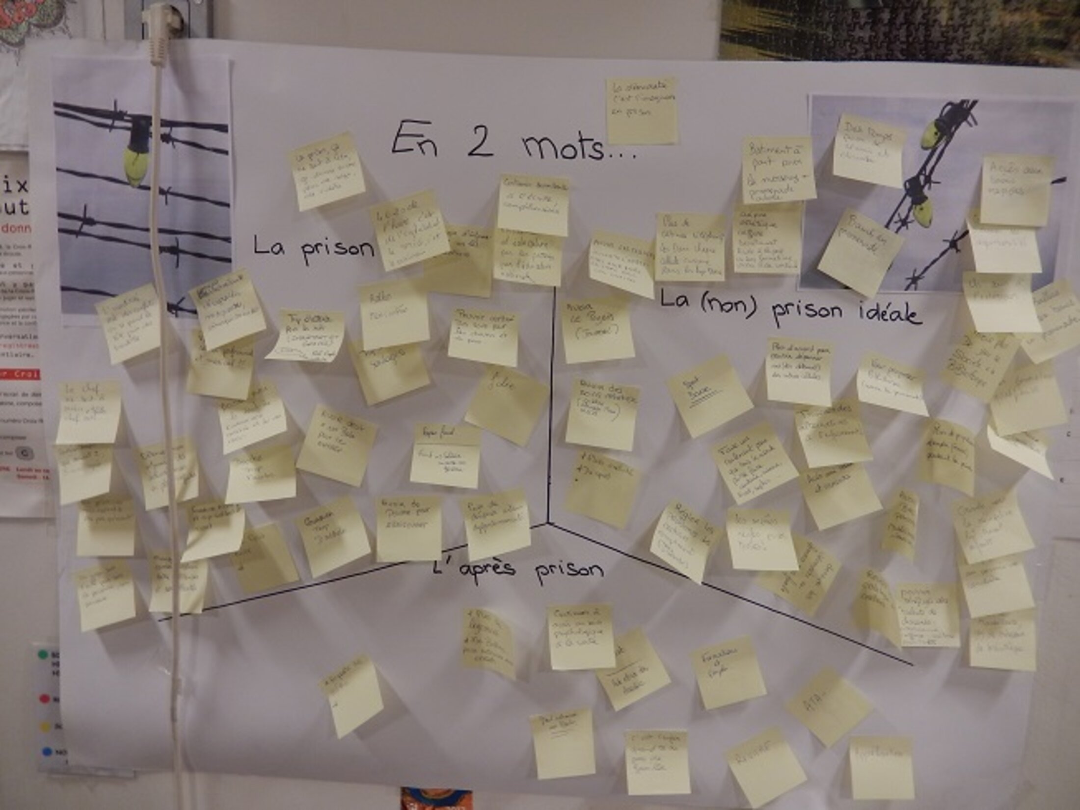 Vivre et faire vivre la démocratie, c’est aussi pour la Bibliothèque Municipale de Lyon introduire et questionner cette thématique derrière les murs de la Maison d’Arrêt de Lyon Corbas. Dans ce but, des murs d’expression ont été mis en place dans les 4 bibliothèques de bâtiments. En 2 mots, 3 post-it… La prison / La (non) prison « idéale » (les améliorations, alternatives à l’emprisonnement) / L’après prison.